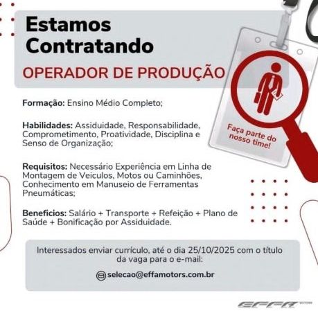 Empresa Effa Motors está selecionando Operador de produção; Envie seu currículo!