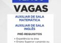 Seleção para Auxiliar de sala matemática, Auxiliar de sala inglês; Envie seu currículo!