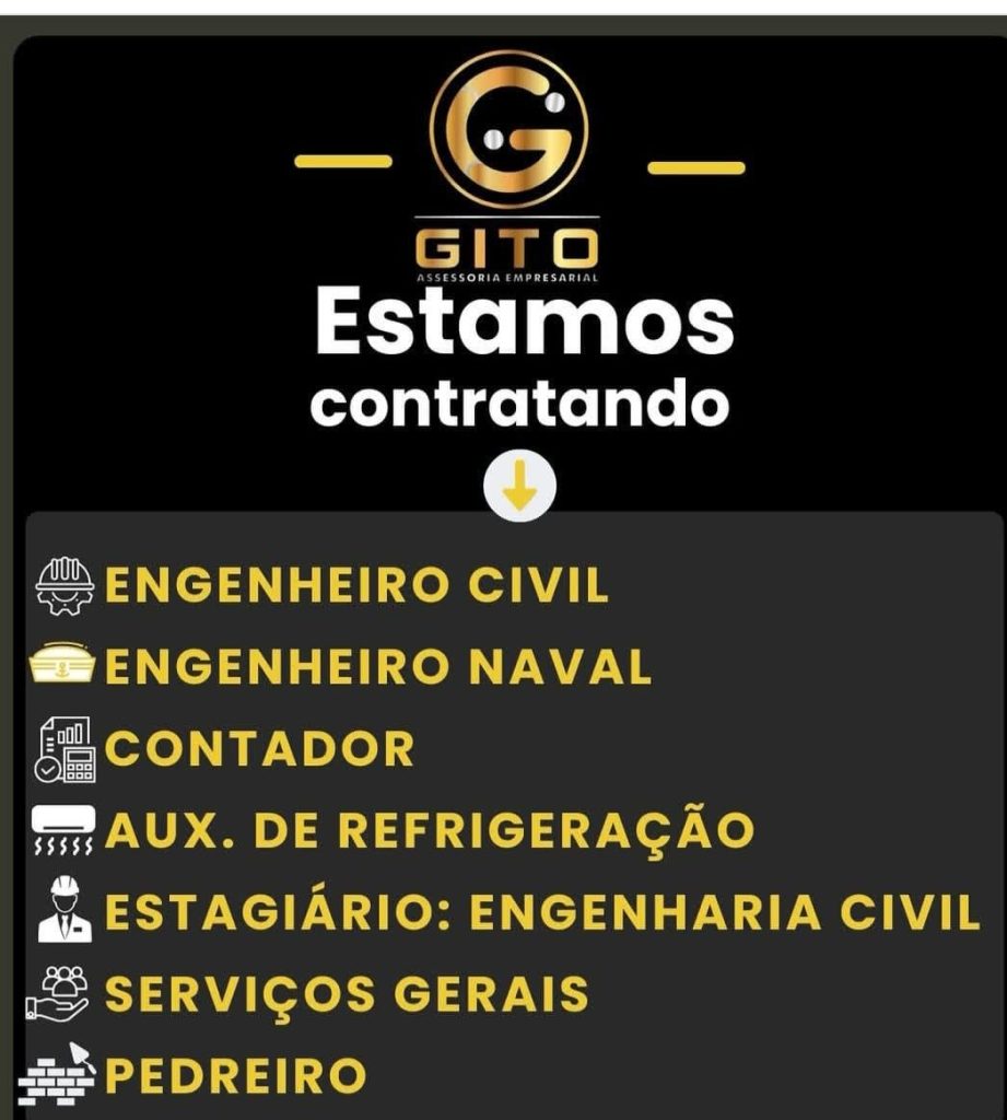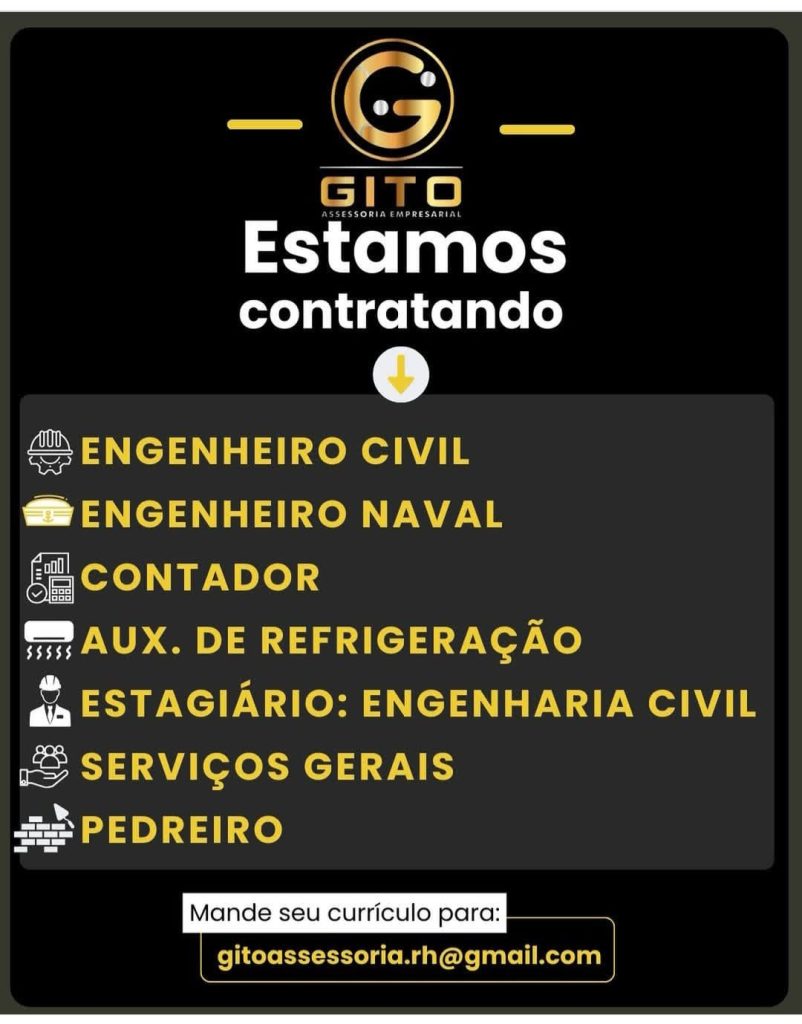 Empresa está selecionando Engenheiro civil, Engenheiro Naval, Contador, Aux de refrigeração, Estagiário engenharia civil, Serviços Gerais, Pedreiro; Envie seu currículo!