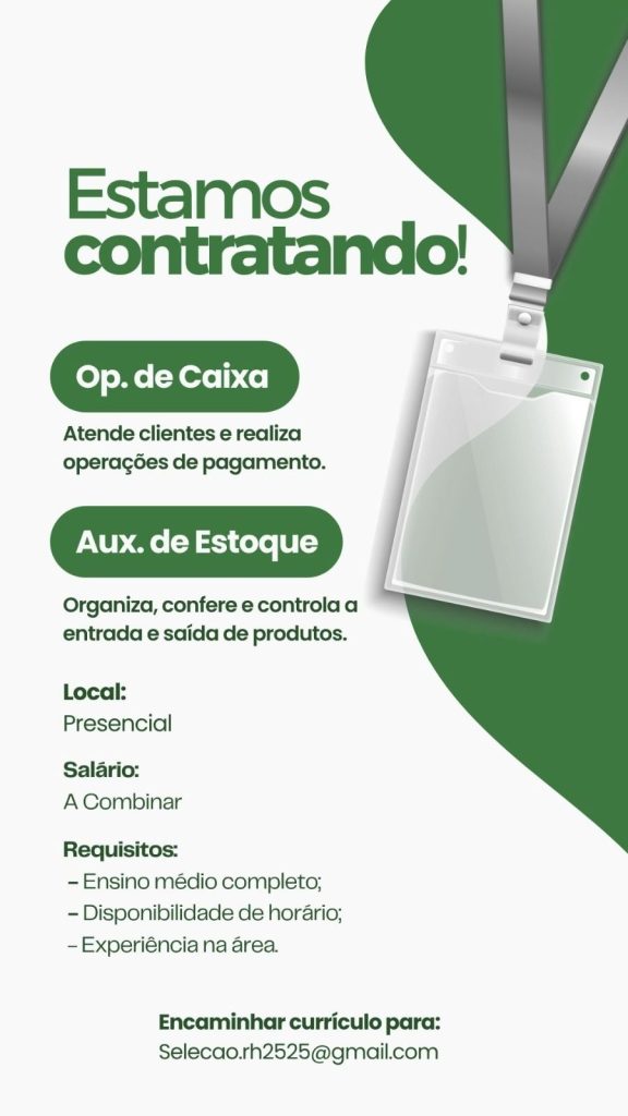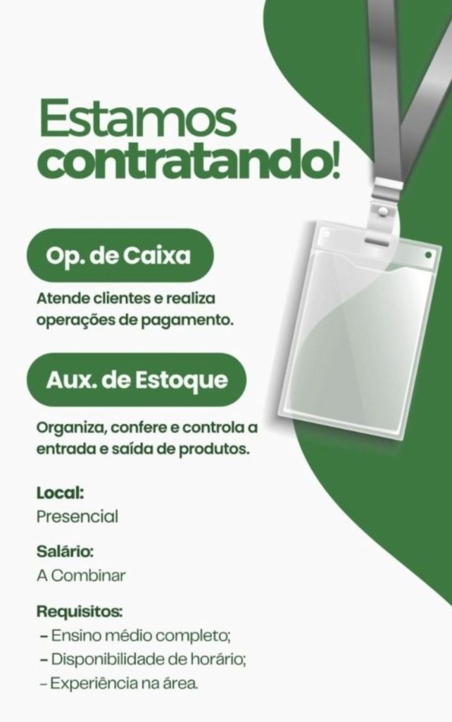 Empresa está selecionando Op de caixa, Aux de estoque; Envie seu currículo!