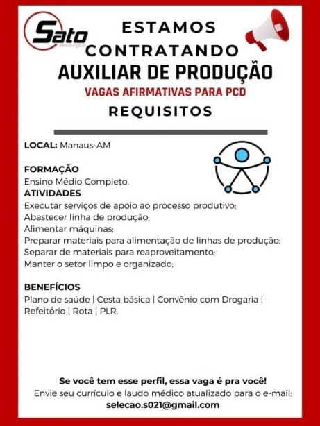 Empresa Sato está selecionando Auxiliar de produção; Envie seu currículo!
