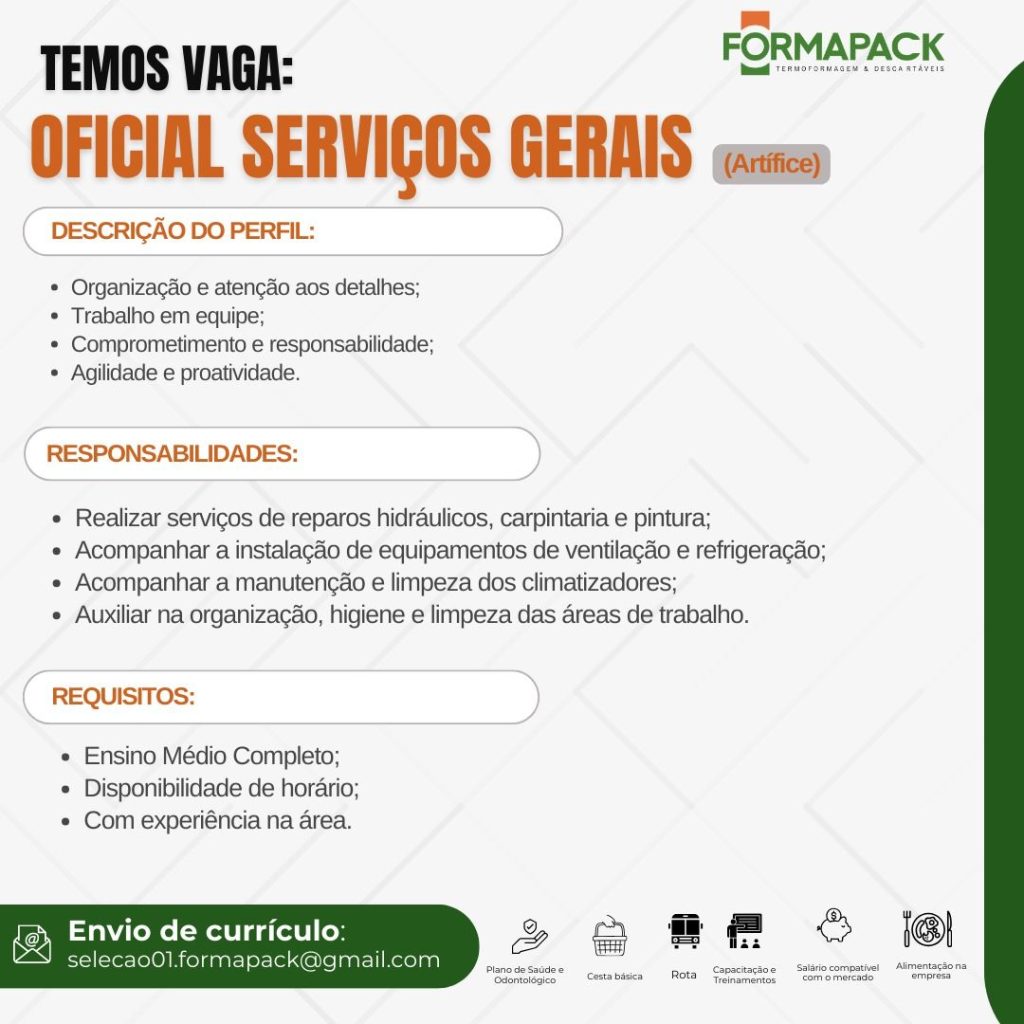 Formapack está selecionando Oficial serviços gerais; Envie seu currículo!