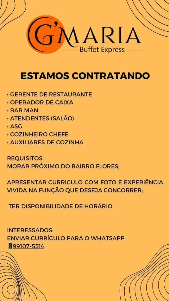 G Maria buffet express seleciona Gerente de restaurante, Operador de caixa, Barman, Atendentes salão, ASG, Cozinheiro chefe, Auxiliares de cozinha; Envie seu currículo!