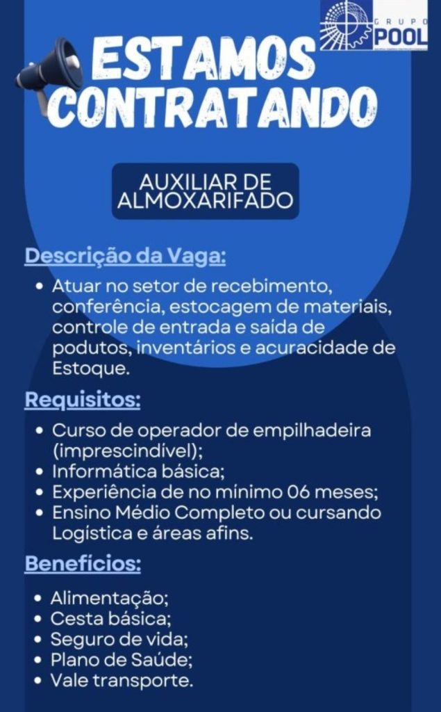 Grupo Pool seleciona Auxiliar de almoxarifado; Envie seu currículo!