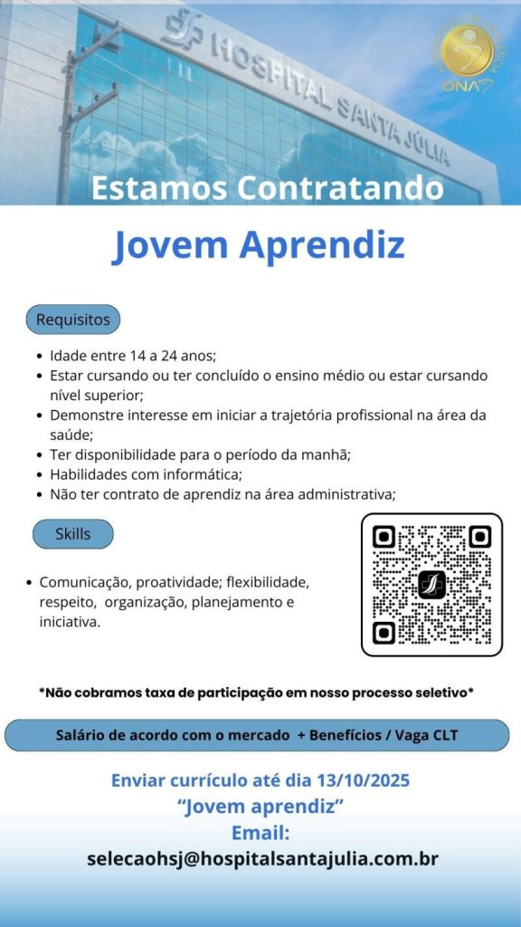 Hospital Santa Júlia seleciona Jovem Aprendiz; Envie seu currículo!