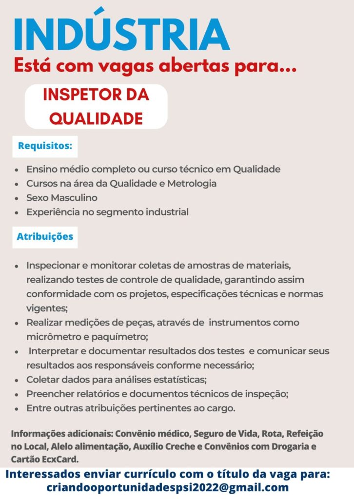 Indústria está selecionando Inspetor da qualidade; Envie seu currículo!
