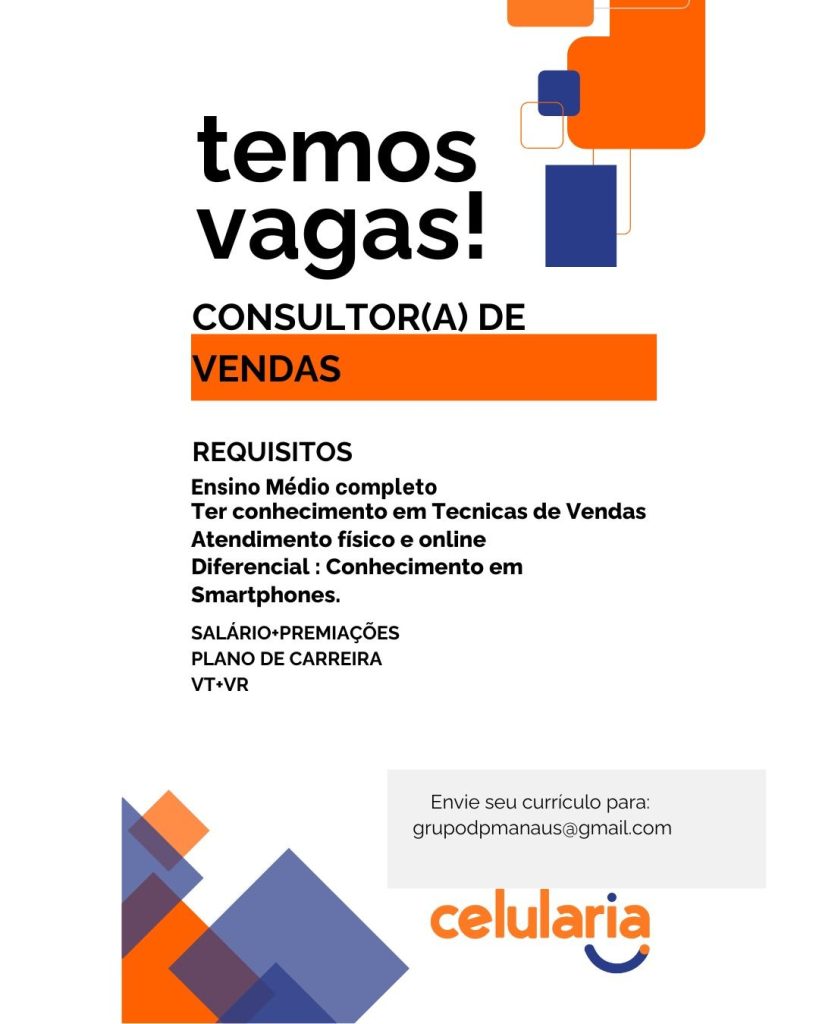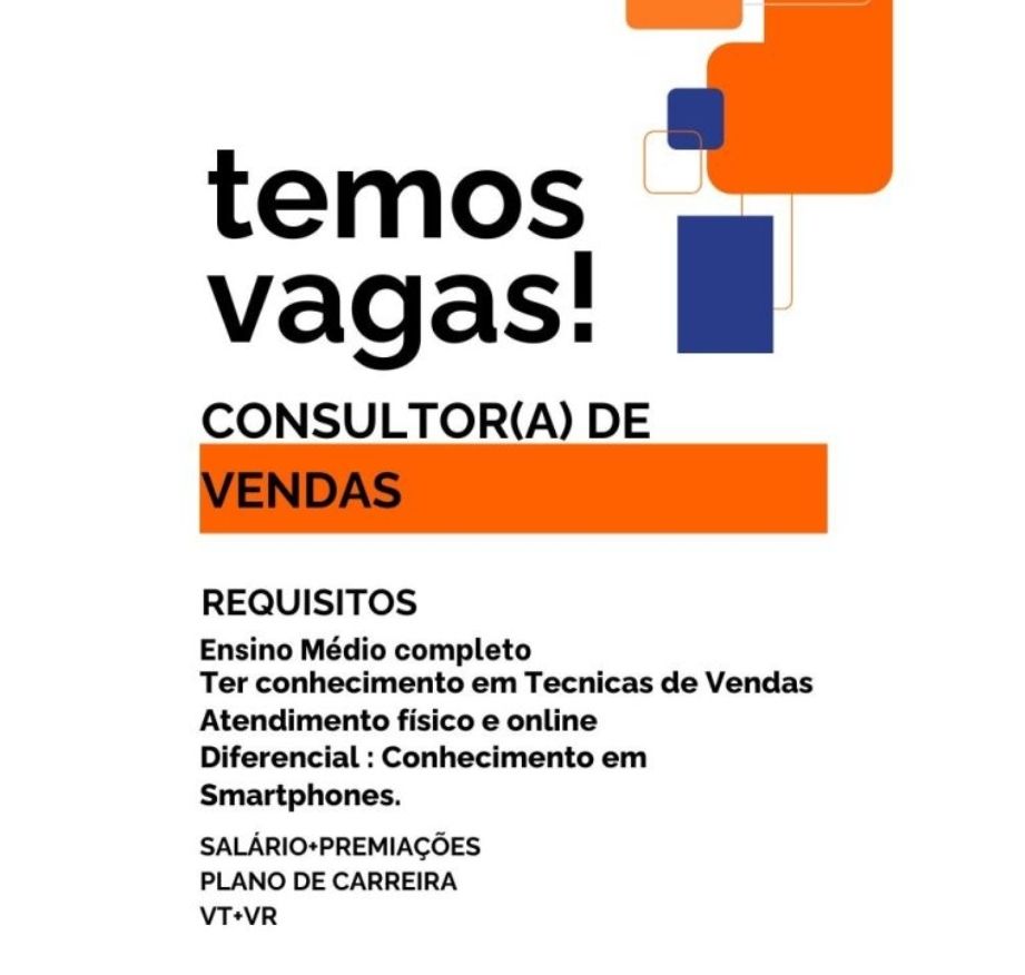 Loja de celular está selecionando Consultor (a) de vendas; Envie seu currículo!