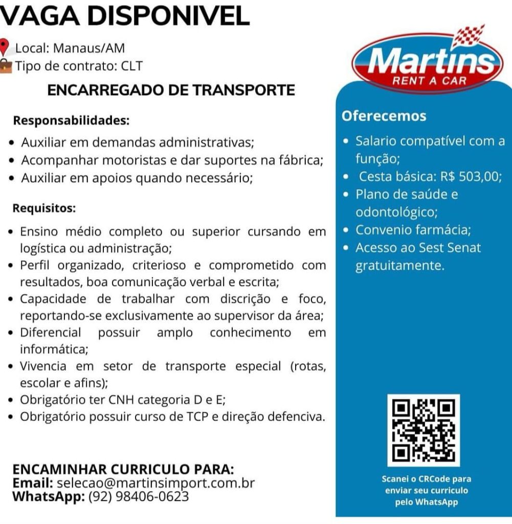 Martins rent a car seleciona Encarregado de transporte; Envie seu currículo!