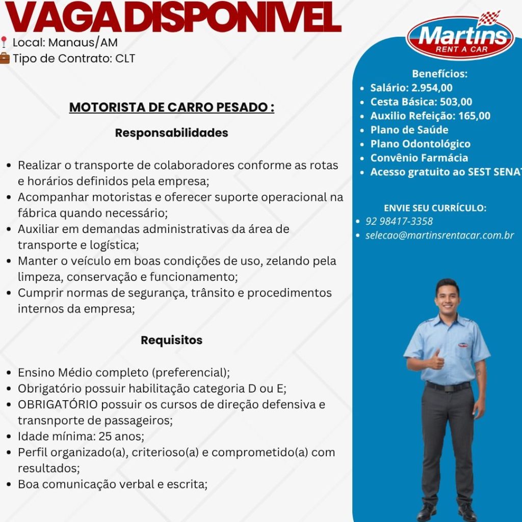Martins rent a car seleciona Motorista de carro pesado; Envie seu currículo!