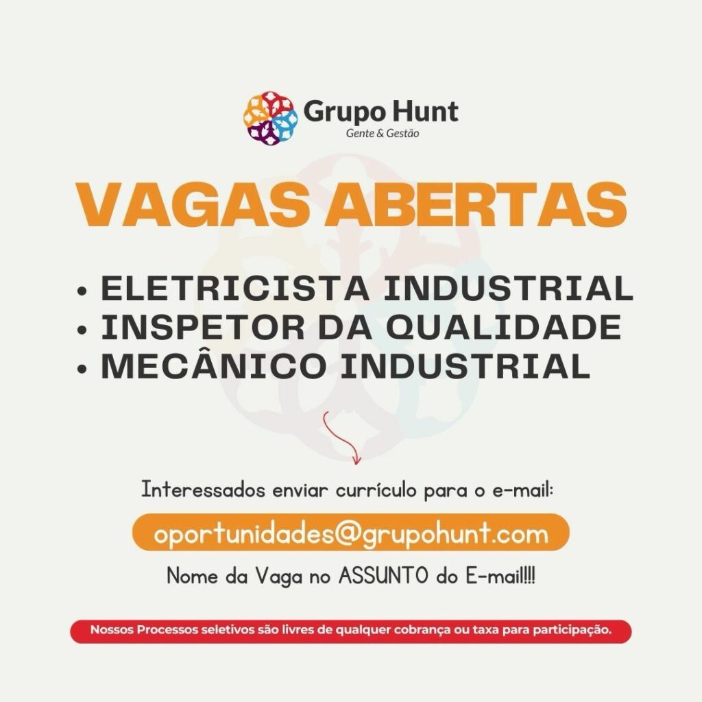 Rh está selecionando Eletricista industrial, Mecânico industrial, Inspetor da qualidade; Envie seu currículo!