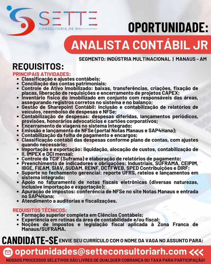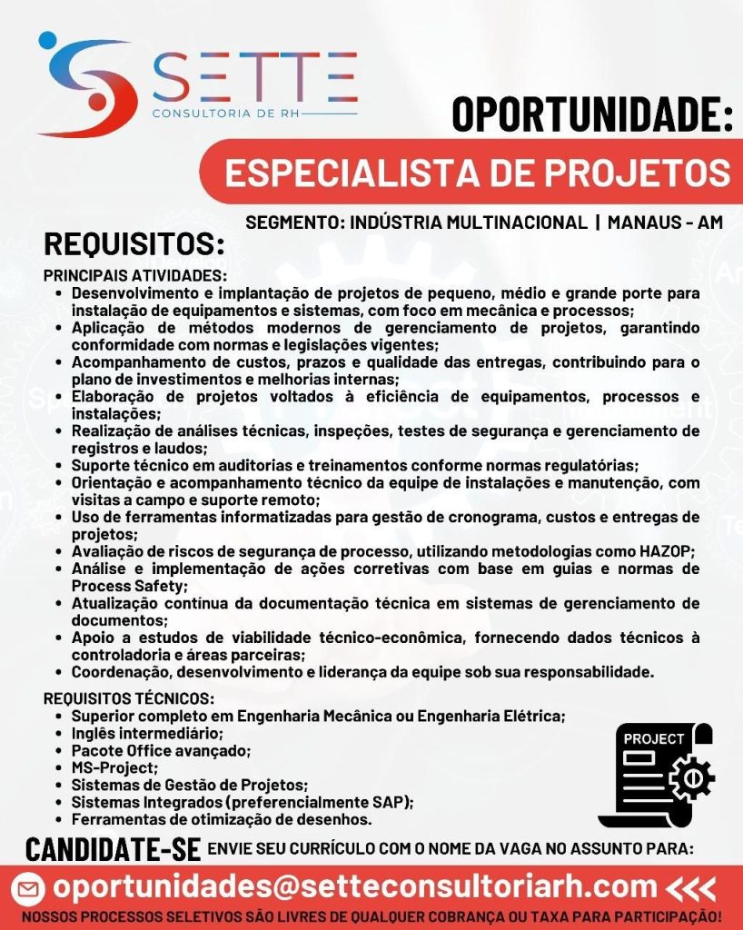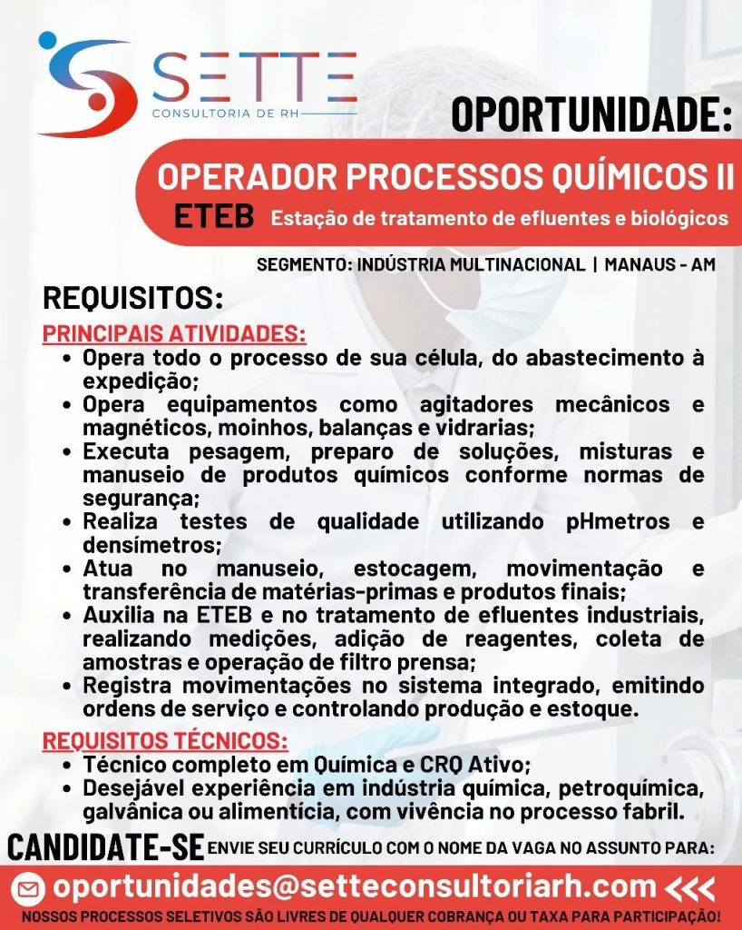 Rh está selecionando Especialista de projetos, Técnico de qualidade assegurada Jr, Vendedor (a), Técnico de Manuntenção mecânica, Operador processos químicos ll, Técnico Eletroeletrônico lll, Analista contábil Jr, Motorista de distribuição; Envie seu currículo!