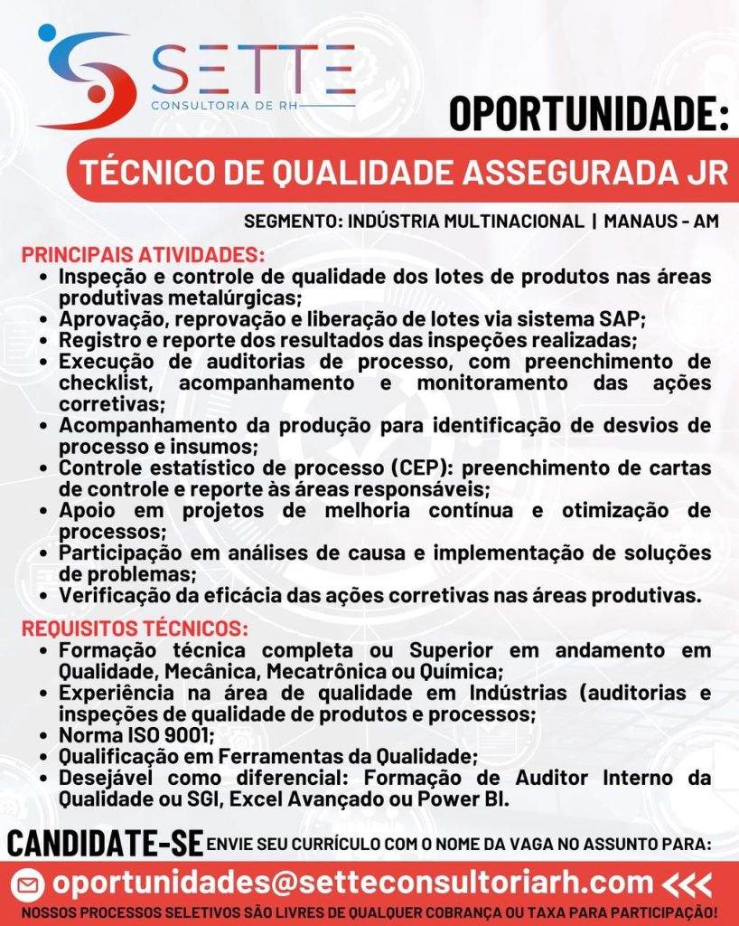 Empresa está selecionando Técnico da qualidade; Envie seu currículo!