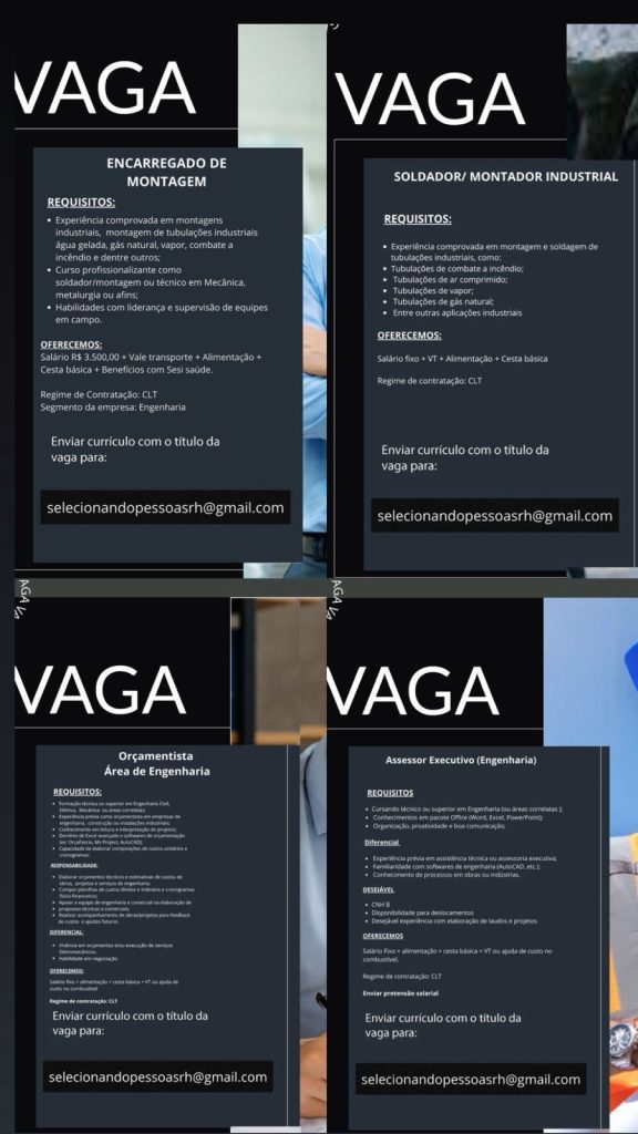Seleção para seguintes vagas Encarregado de montagem, Soldador Montador industrial, Orçamentista área engenharia, Assessor executivo engenharia; Envie seu currículo!