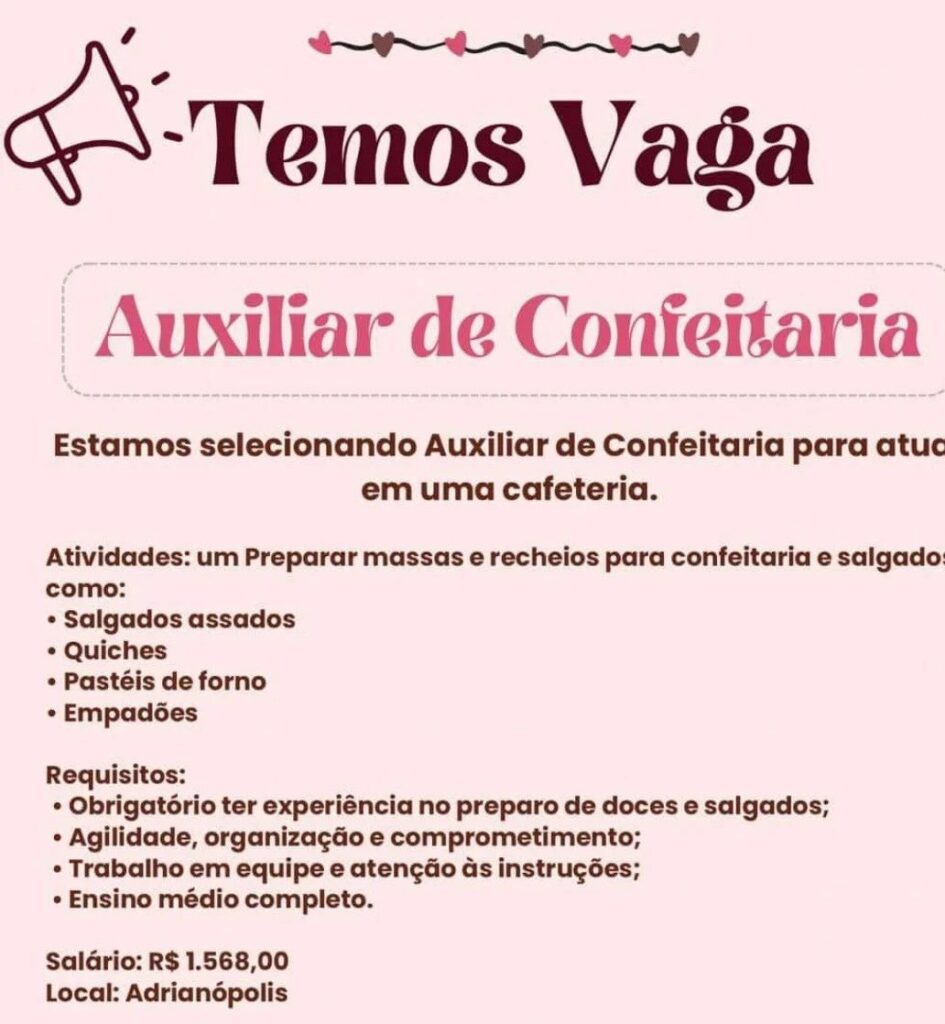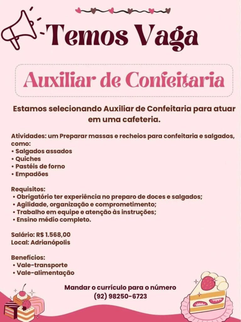 Seleção para vaga de Auxiliar de confeitaria; Envie seu currículo!