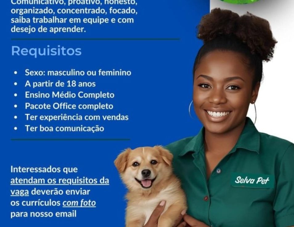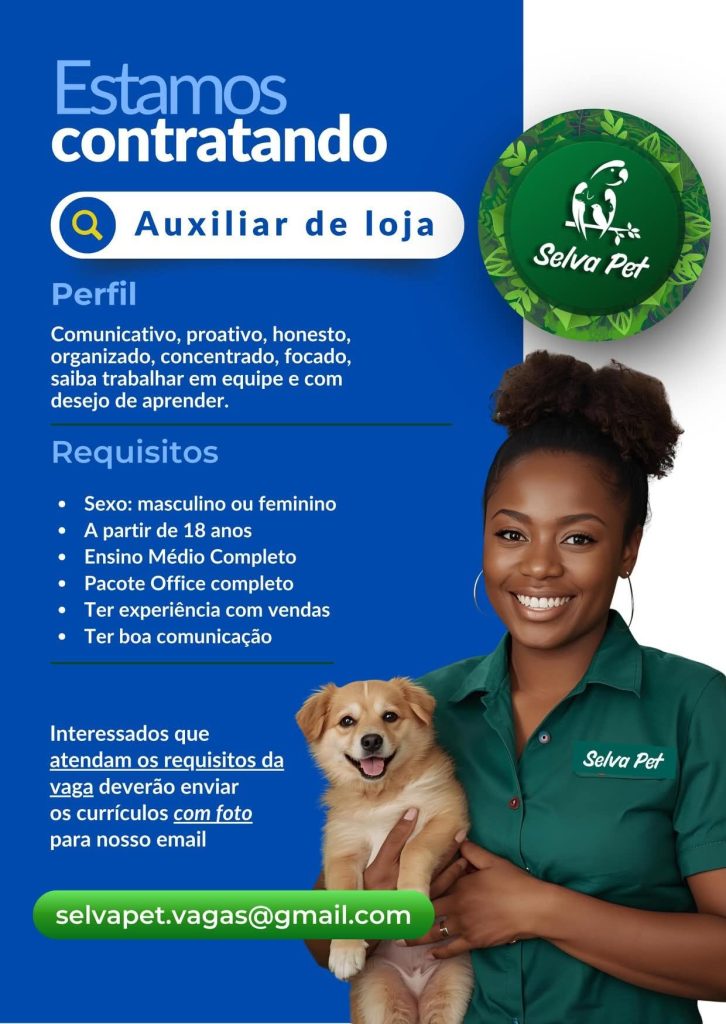 Selva pet está selecionando Auxiliar de loja; Envie seu currículo!