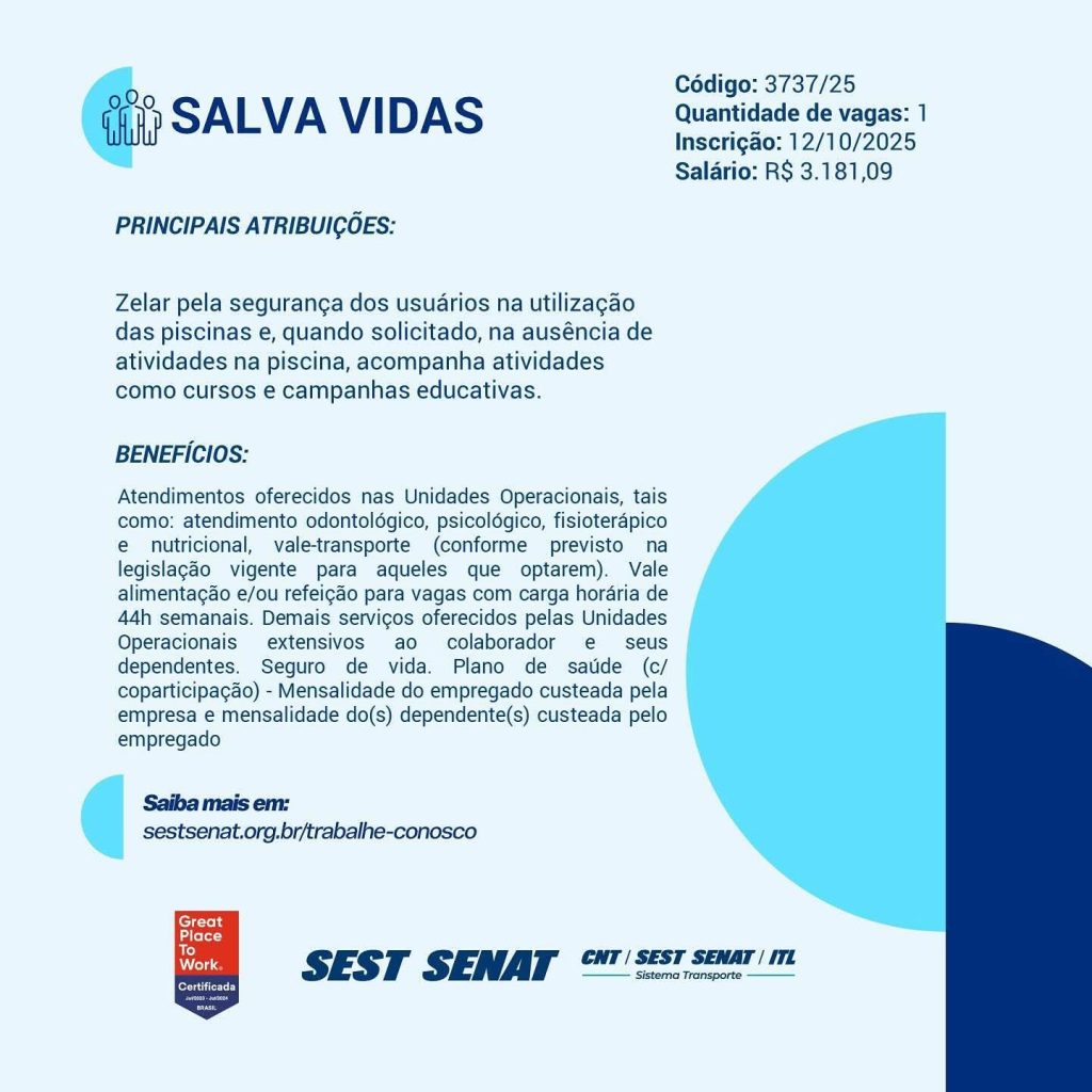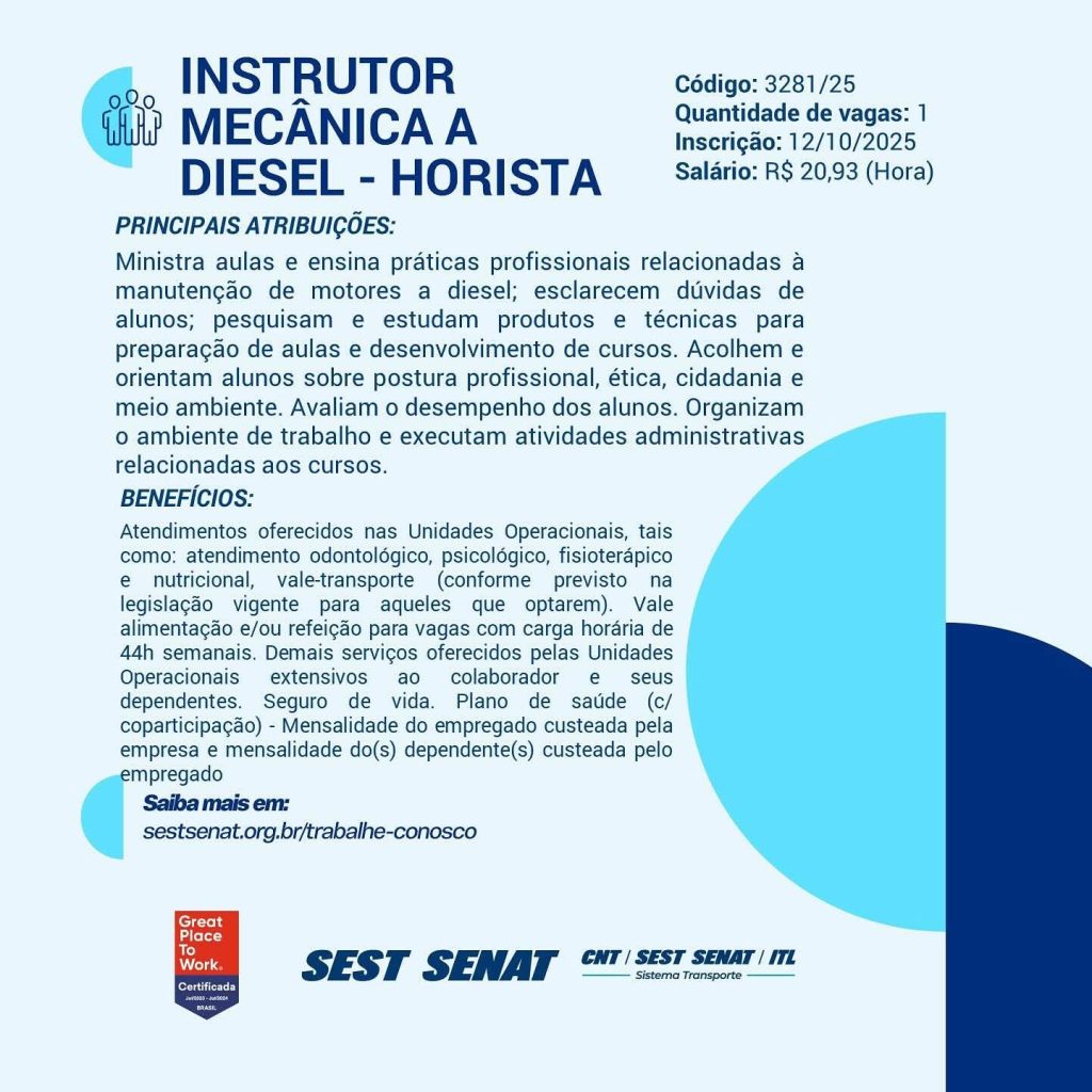 Sest Senat está selecionando Instrutor mecânica a diesel, Salva vidas, Nutricionista; Envie seu currículo!