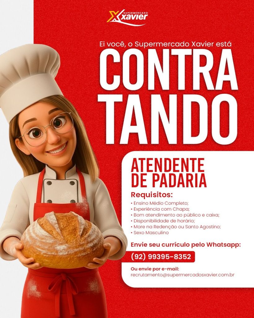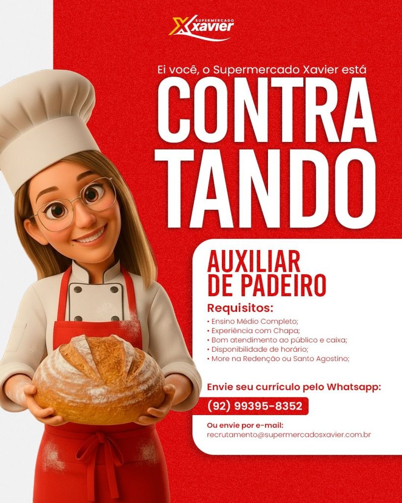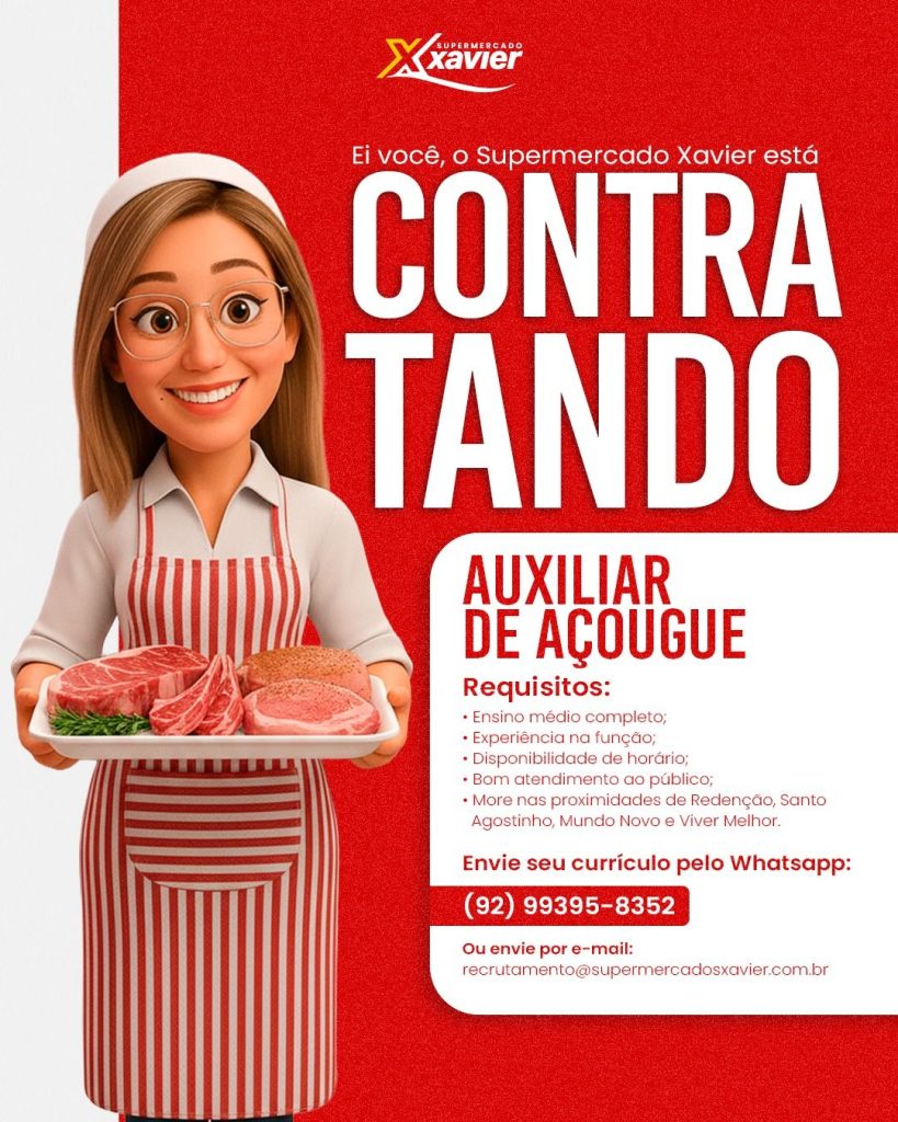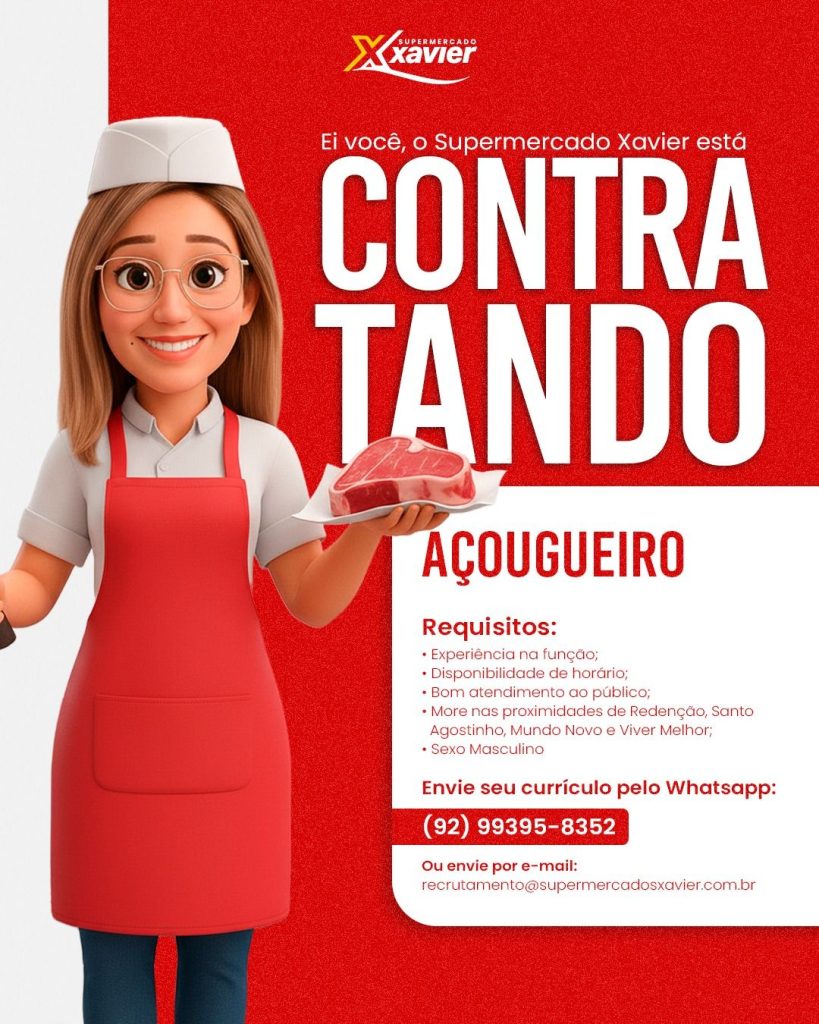 Supermercado Xavier está selecionando Auxiliar de Padeiro, Motoboy, Peixeiro, Auxiliar de açougue, Operador (a) de caixa, Operador (a) de Loja, Atendente de padaria, Confeiteiro, Açougueiro; Envie seu currículo!