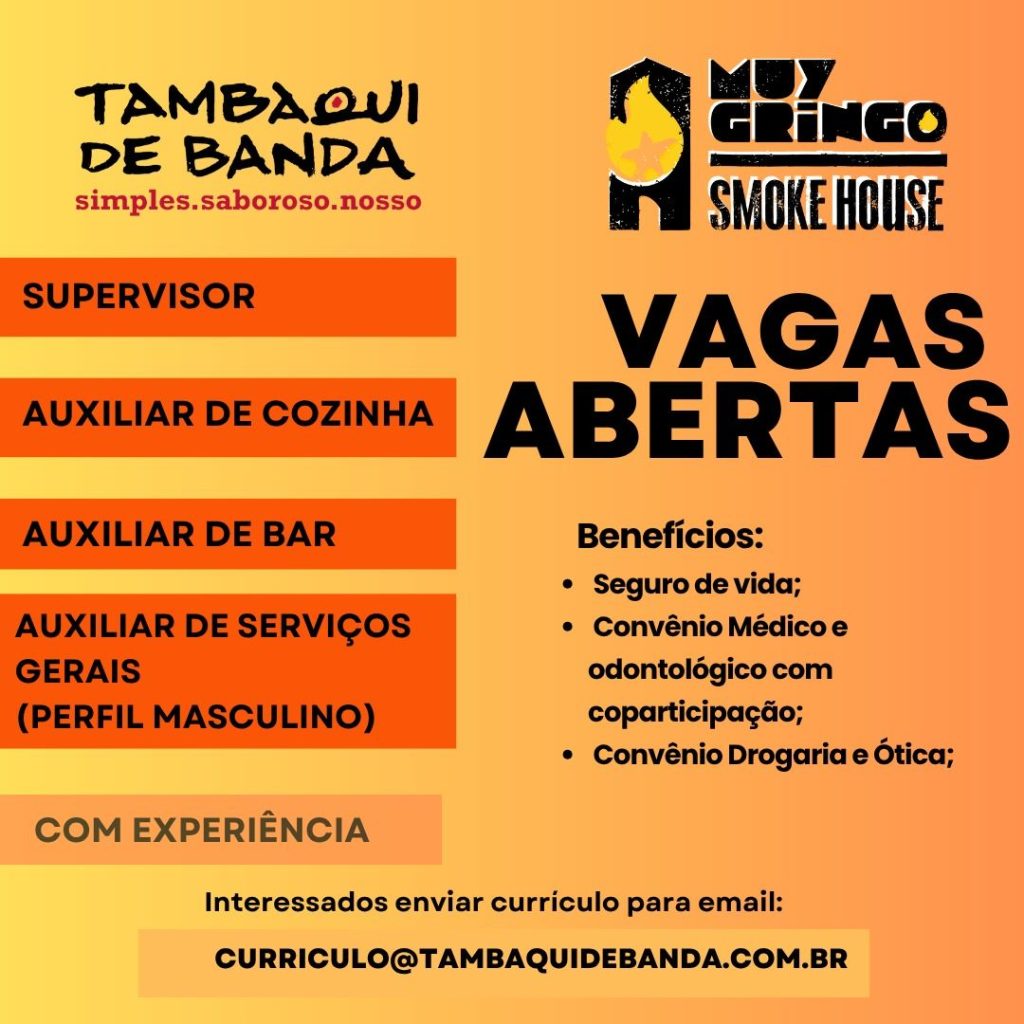 Tambaqui de banda seleciona Supervisor, Auxiliar de cozinha, Auxiliar de bar, Auxiliar de serviços gerais; Envie seu currículo!