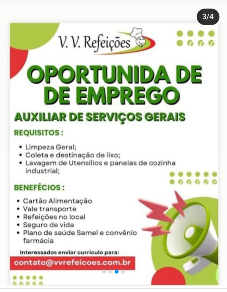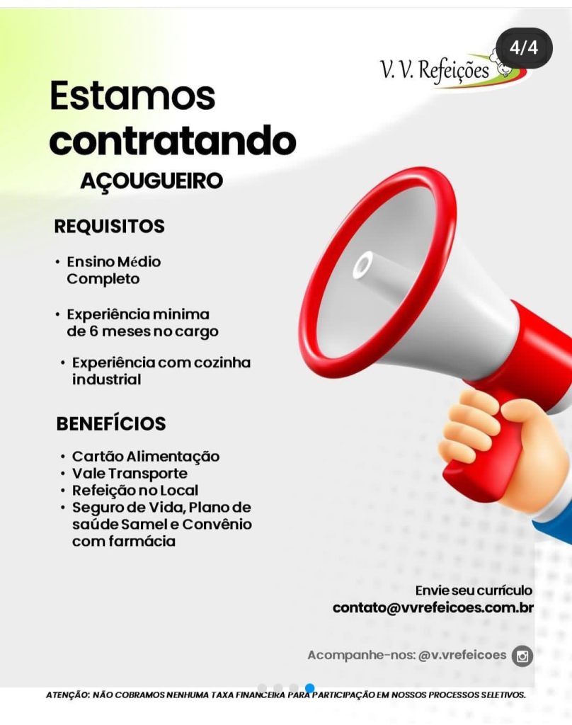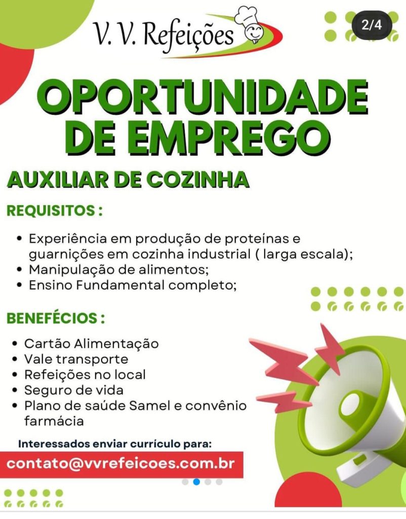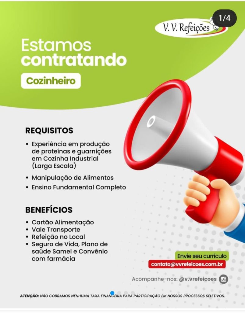 VV refeições seleciona Cozinheiro, Auxiliar de cozinha, Auxiliar de serviços gerais, Açougueiro; Envie seu currículo!
