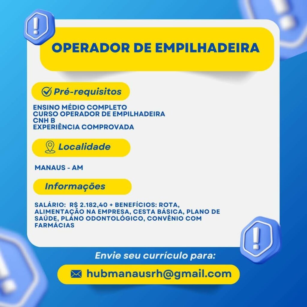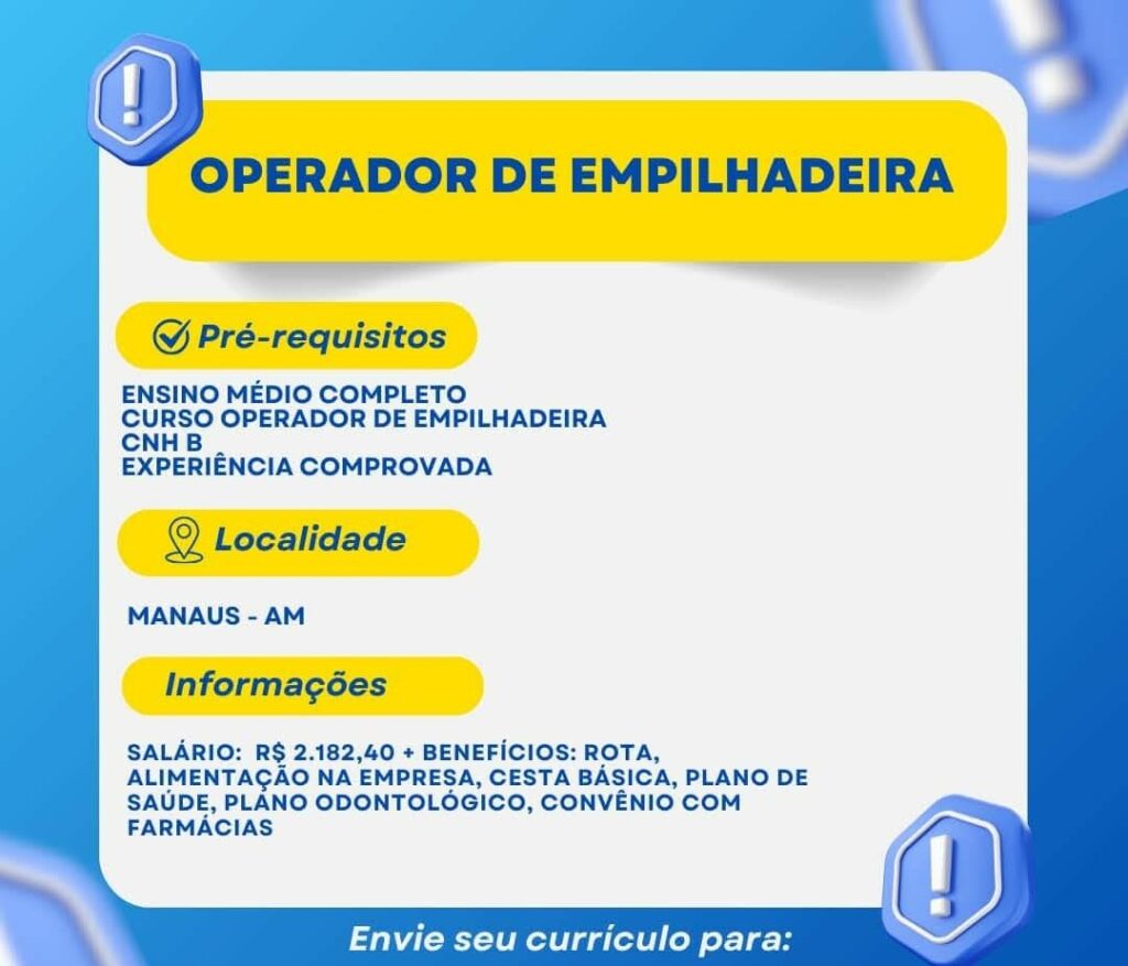 Empresa seleciona para vaga de Operador de empilhadeira; Envie seu currículo!