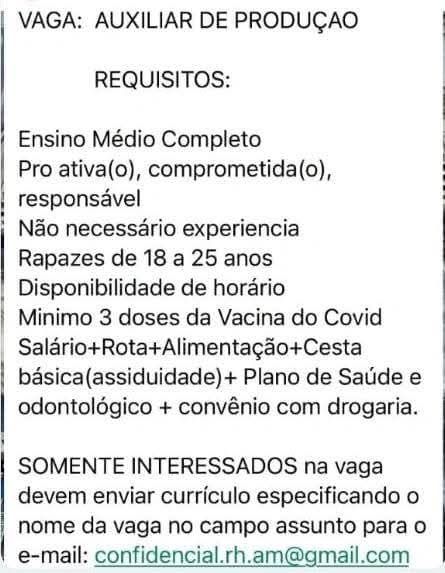 Não é necessário experiência! Indústria Seleciona para Auxiliar de Produção; Envie seu currículo!