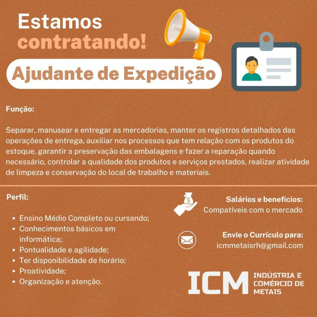 Empresa seleciona para vaga de Ajudante de expedição;  Envie seu currículo!
