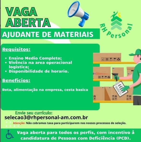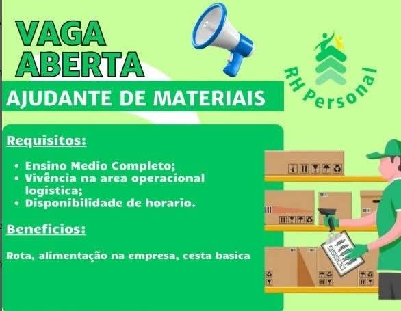 Rh seleciona para vaga de Ajudante de materiais; Envie seu currículo!