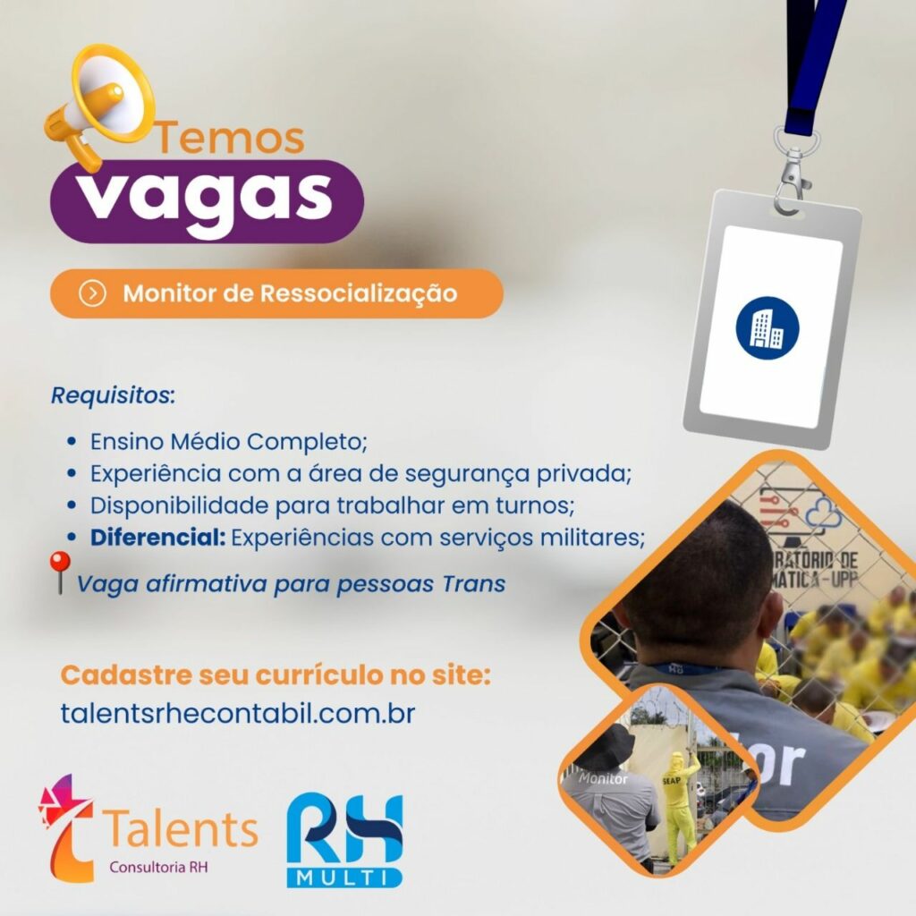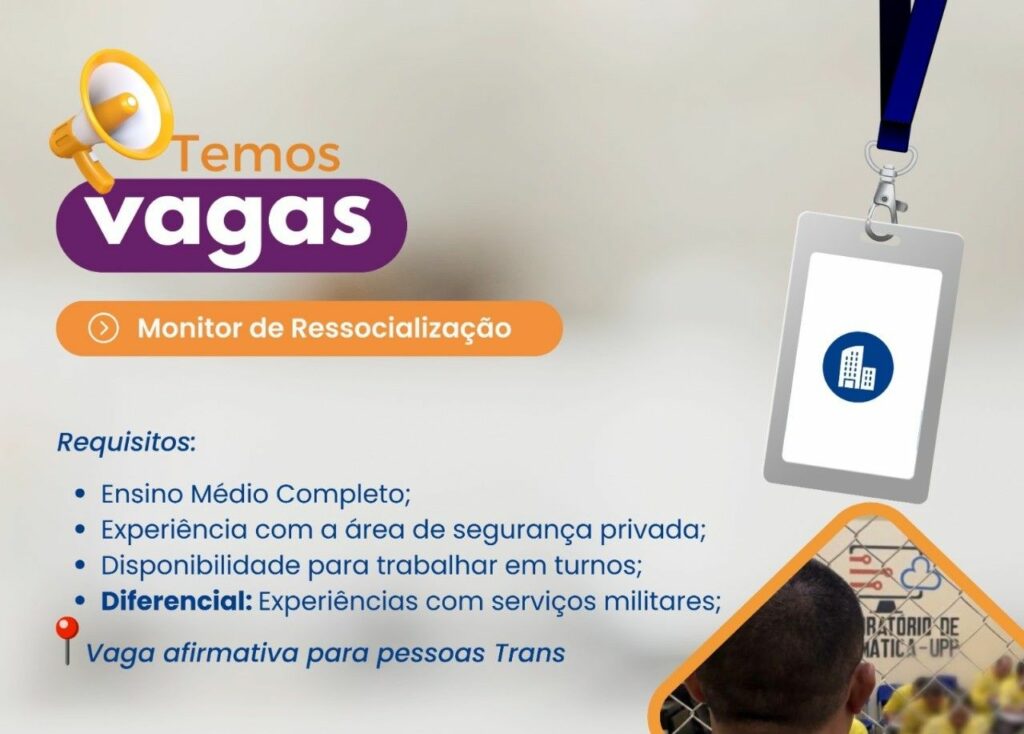 Empresa seleciona Monitor de ressocialização; Envie seu currículo!