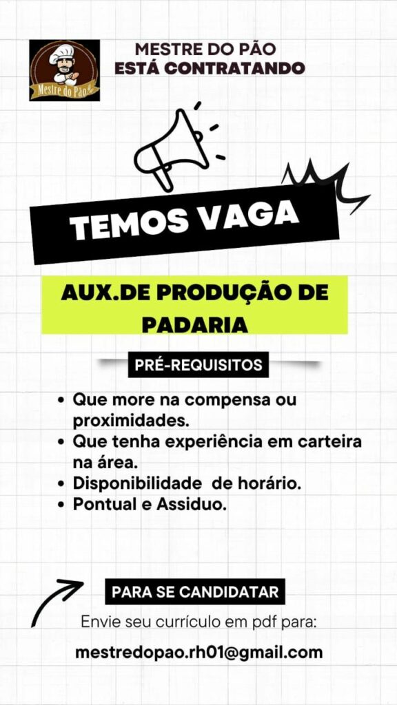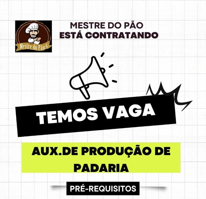 Mestre do pão está contratando Auxiliar de produção de padaria; Envie seu currículo!
