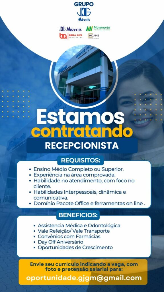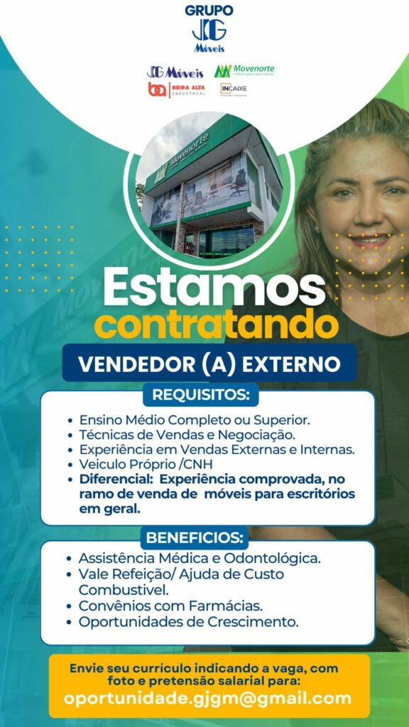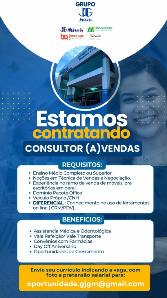 Grupo JG móveis está selecionando Recepcionista, Vendedor (a) externo, Consultor (a) de vendas; Envie seu currículo!