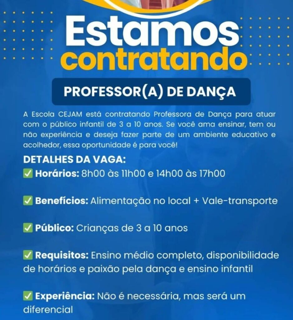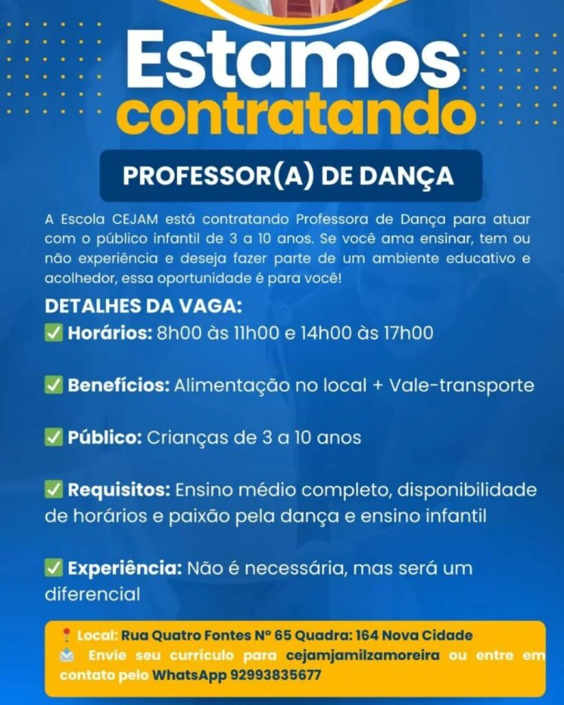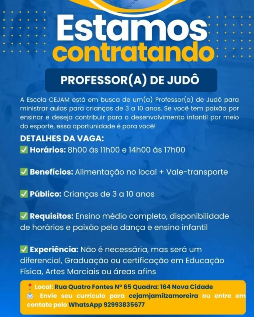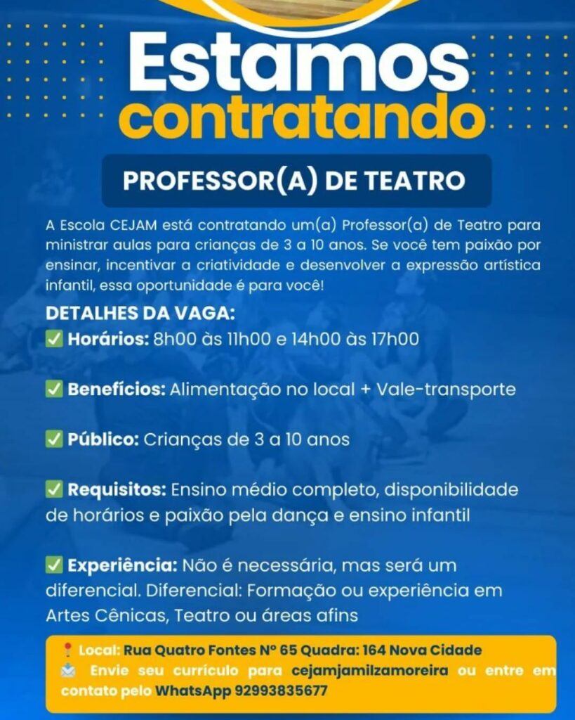 Seleção para seguintes vagas Professor (a) de teatro, Professor (a) de judô, Professor (a) de dança; Envie seu currículo!
