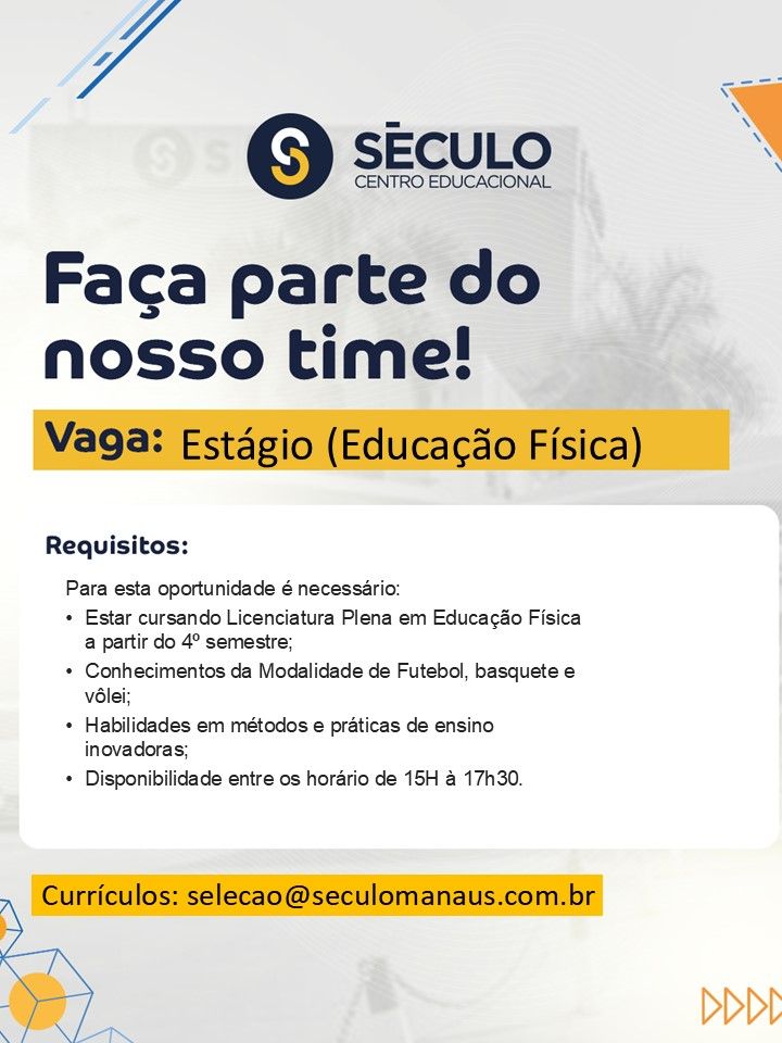 Centro educacional Século seleciona Psicopedagogia, Estágio educação física; Envie seu currículo!
