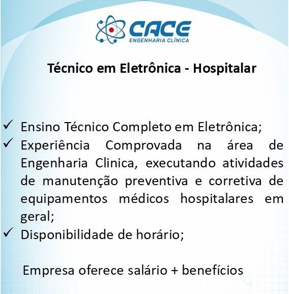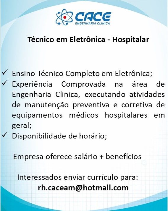 Cace engenharia clínica seleciona Técnico em eletrônica hospitalar; Envie seu currículo!