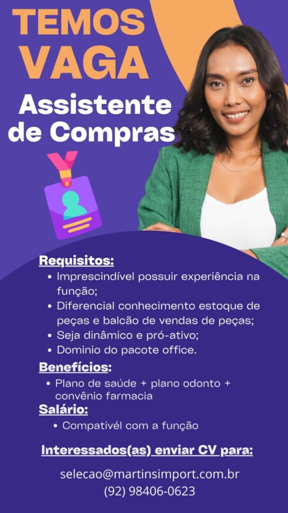 Empresa está selecionando Assistente de compras; Envie seu currículo!