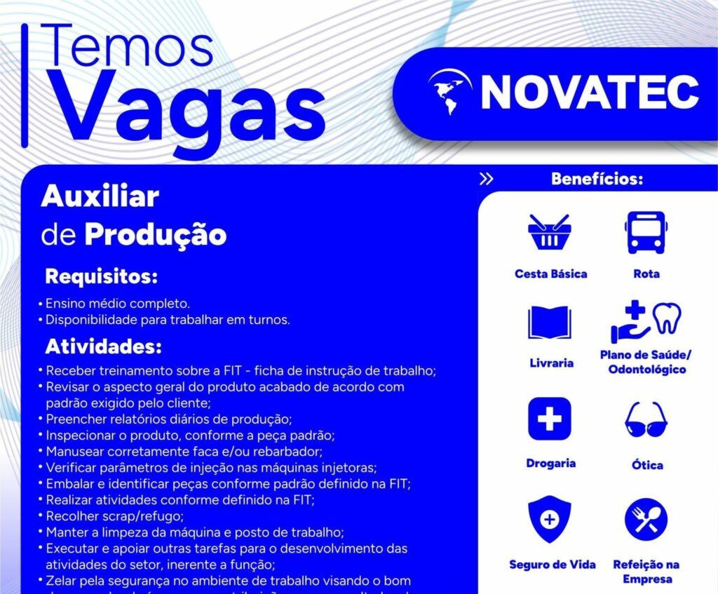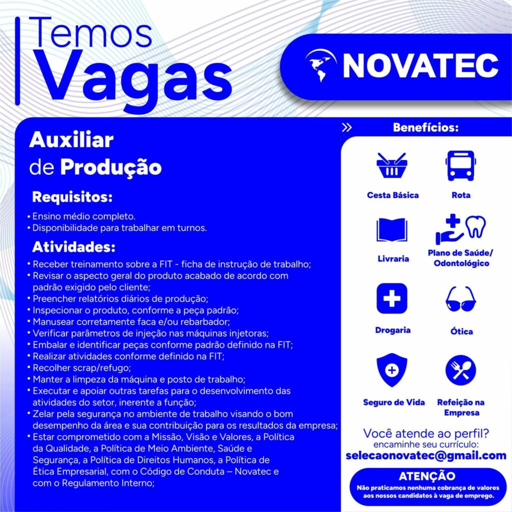 Empresa de grande porte contrata Auxiliar de produção & Jovem Aprendiz; Envie seu currículo!