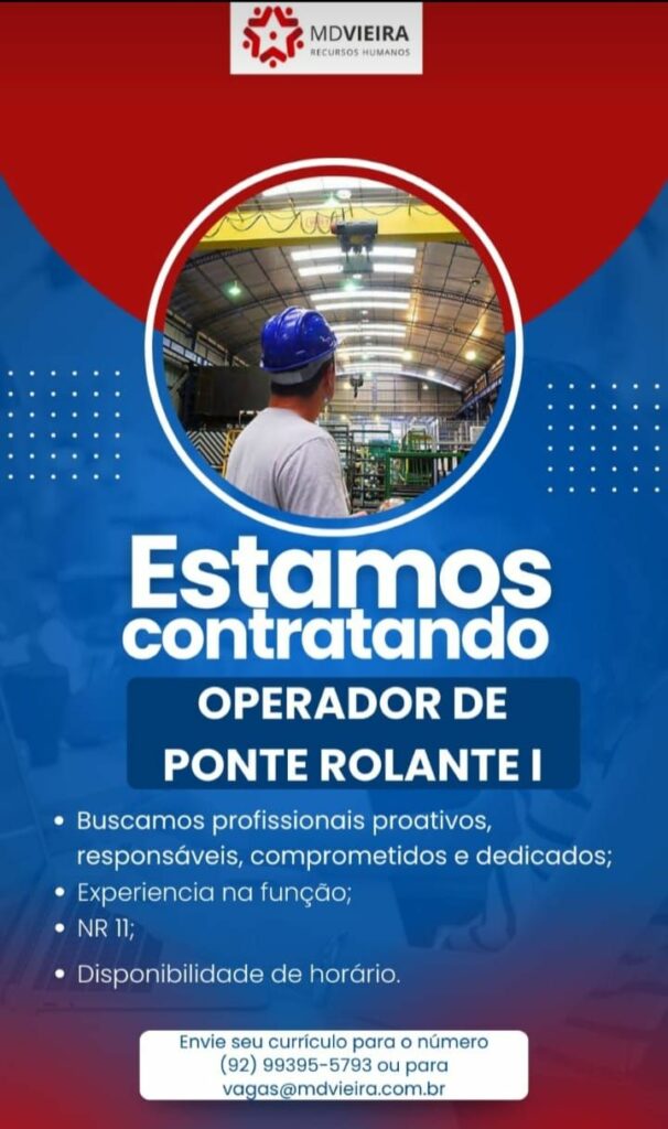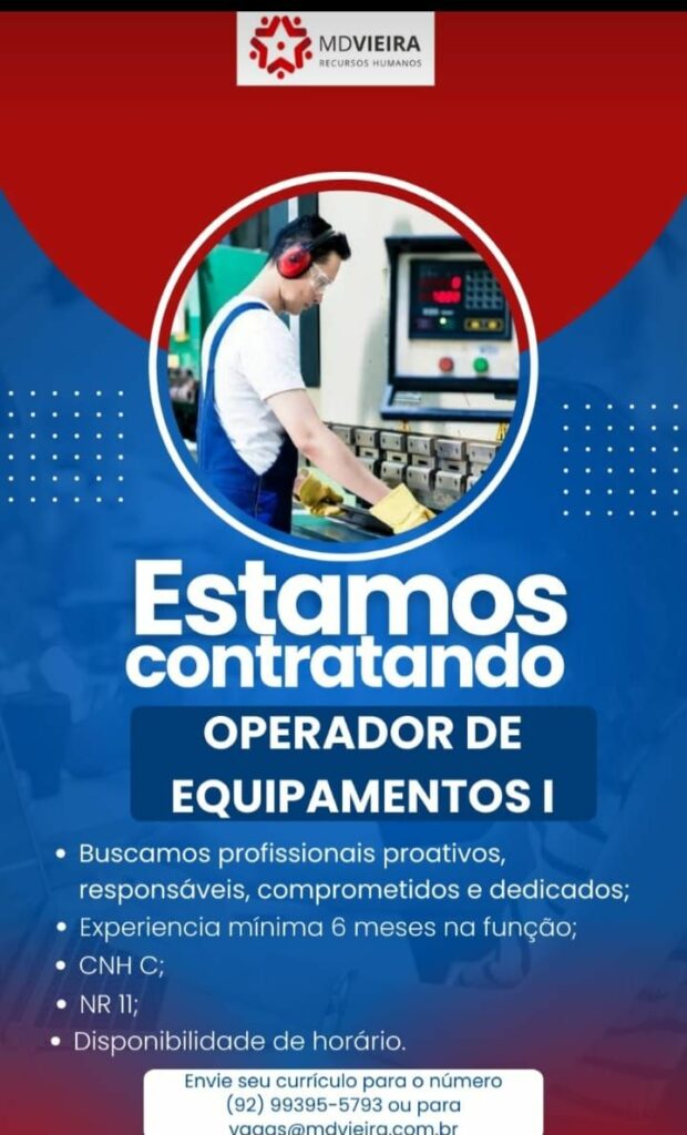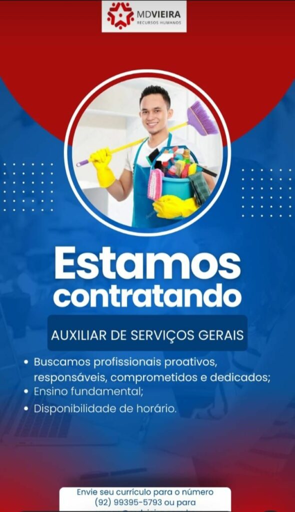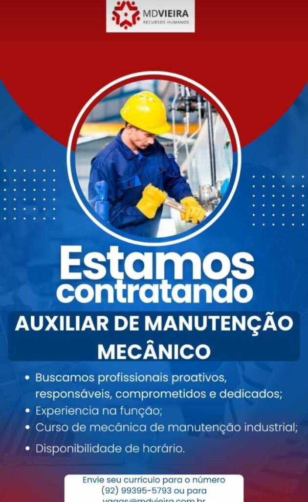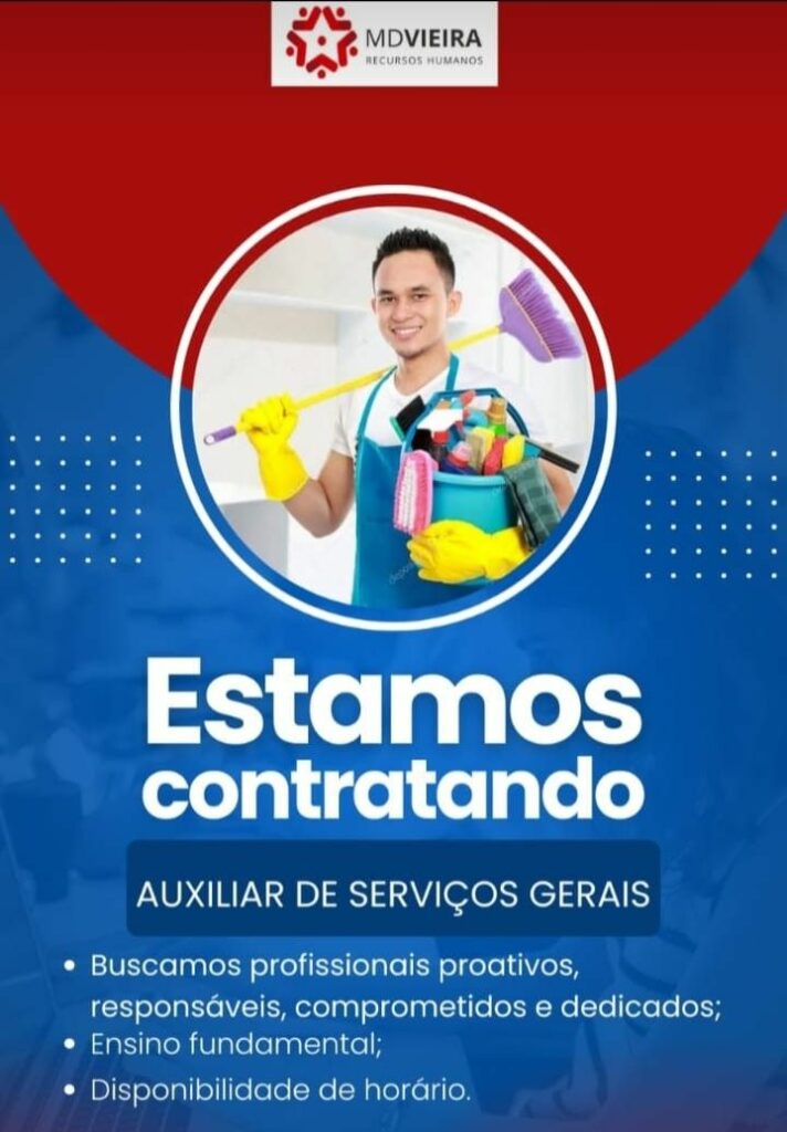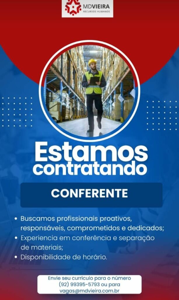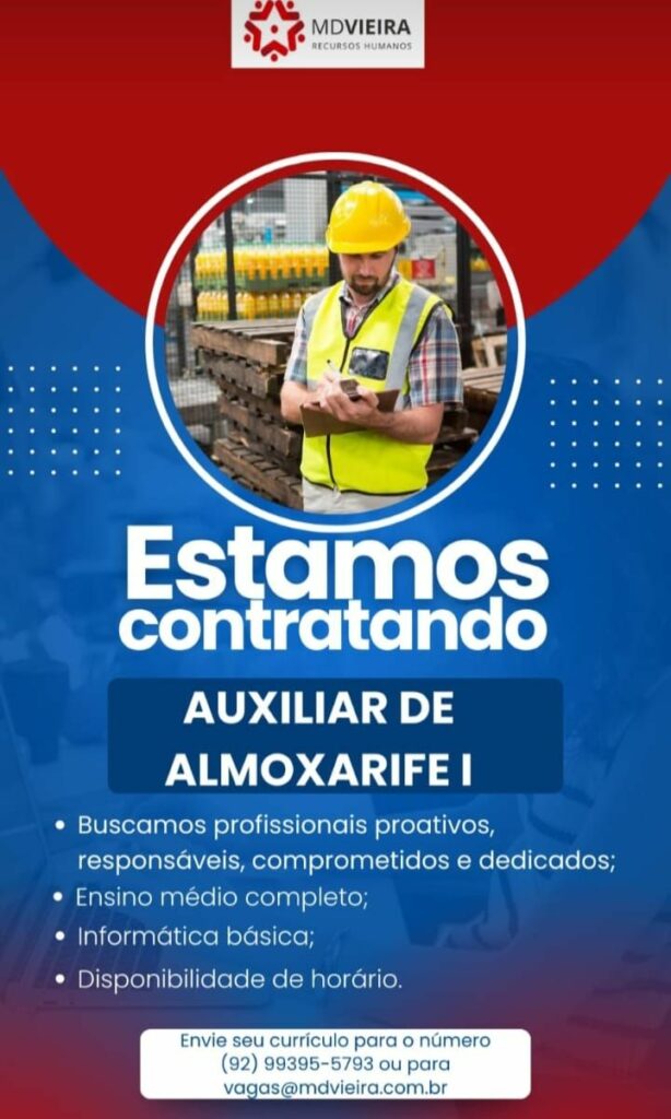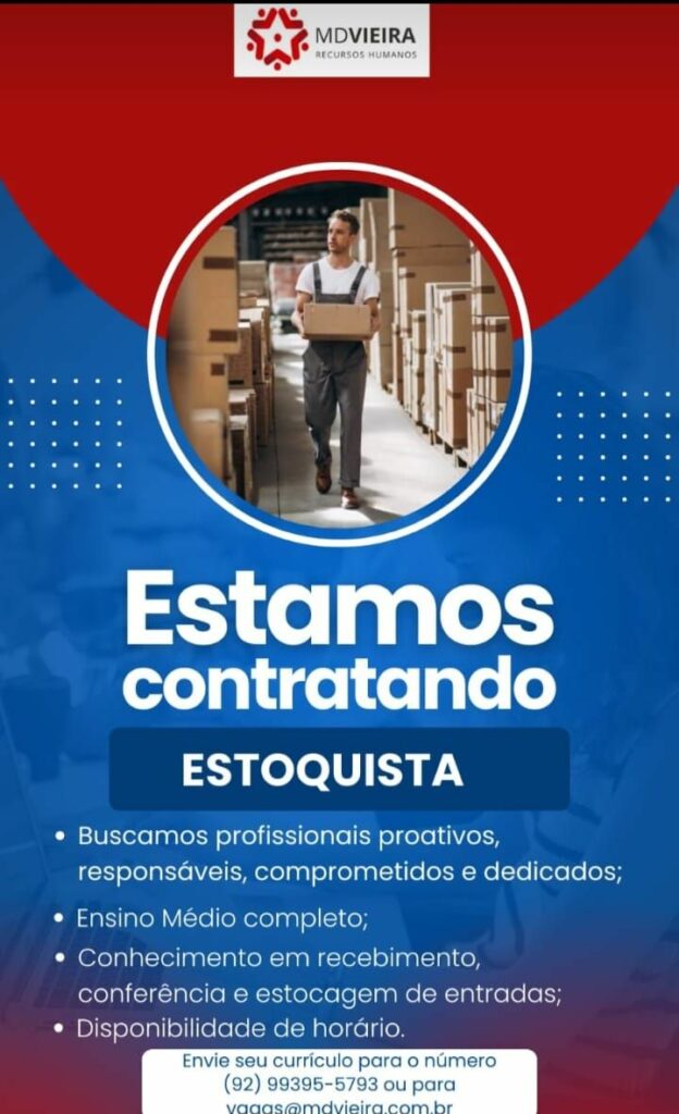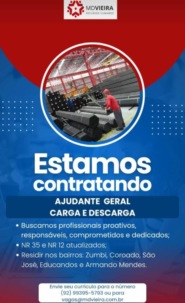 MD Vieira está selecionando Operador de equipamentos l, Ajudante geral carga e descarga, Auxiliar de almoxarife l, Operador de ponte Rolante l, Estoquista, Auxiliar de manutenção mecânico, Conferente, Auxiliar de serviços gerais; Envie seu currículo!