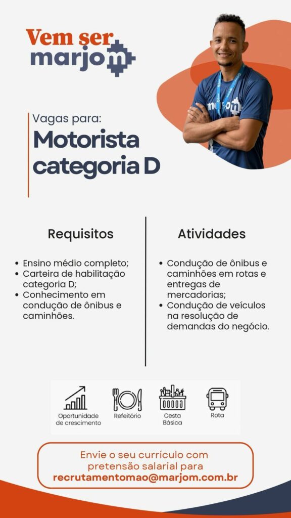 Seleção para Auxiliar de Produção, Motorista Cat D, Auxiliar de carga e descarga; Envie seu currículo!
