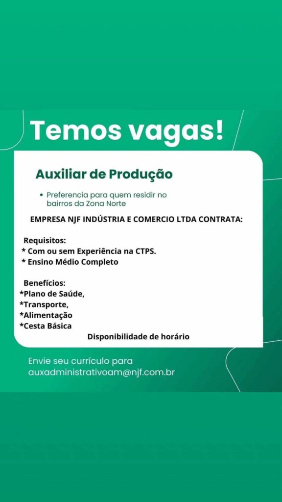 Com ou sem experiência! Empresa NJF indústria e comércio contrata Auxiliar de produção; Envie seu currículo!