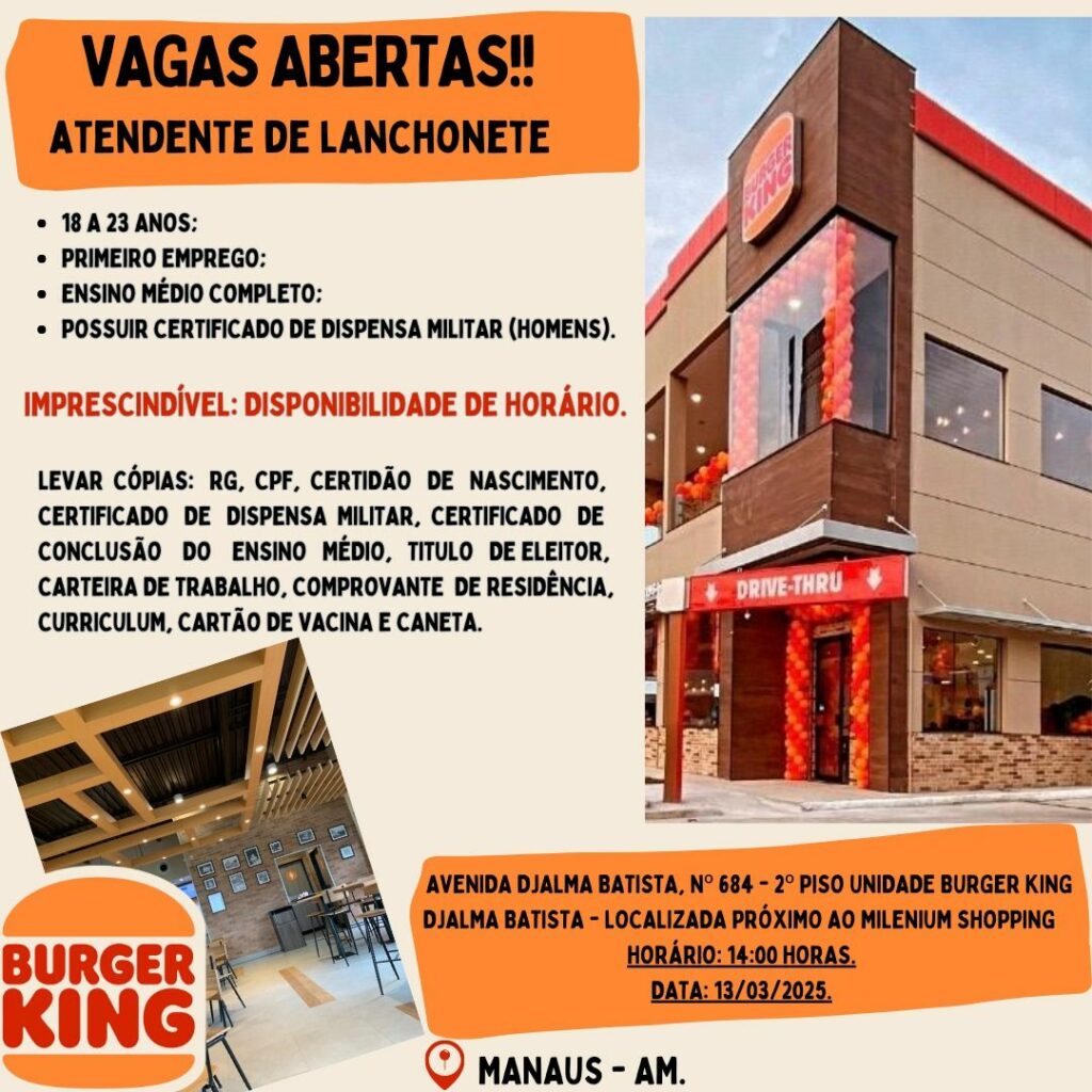 Burger King está selecionando Primeiro Emprego Atendente de lanchonete; Envie seu currículo!