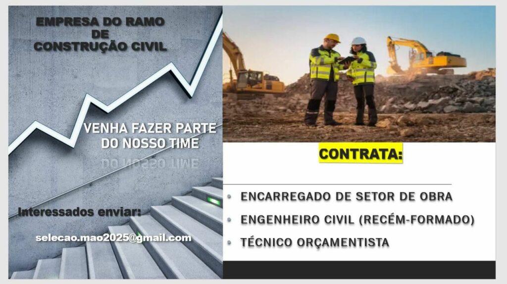 Empresa do ramo de construção civil contrata Encarregado de setor de obra, Engenheiro civil, Técnico Orçamentista; Envie seu currículo!