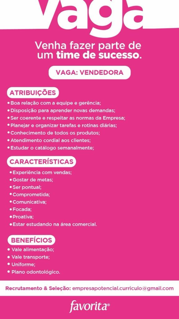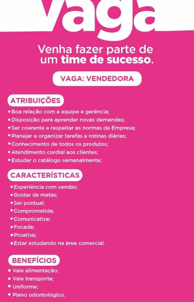 Empresa seleciona para vaga de Vendedora; Envie seu currículo!