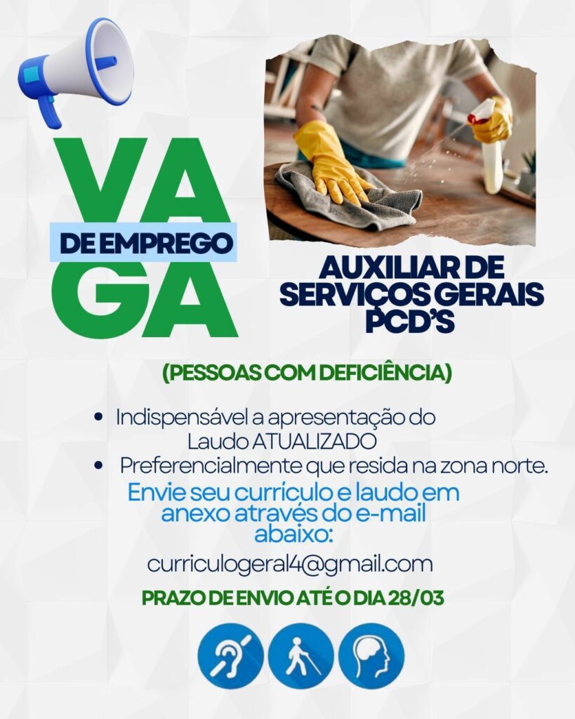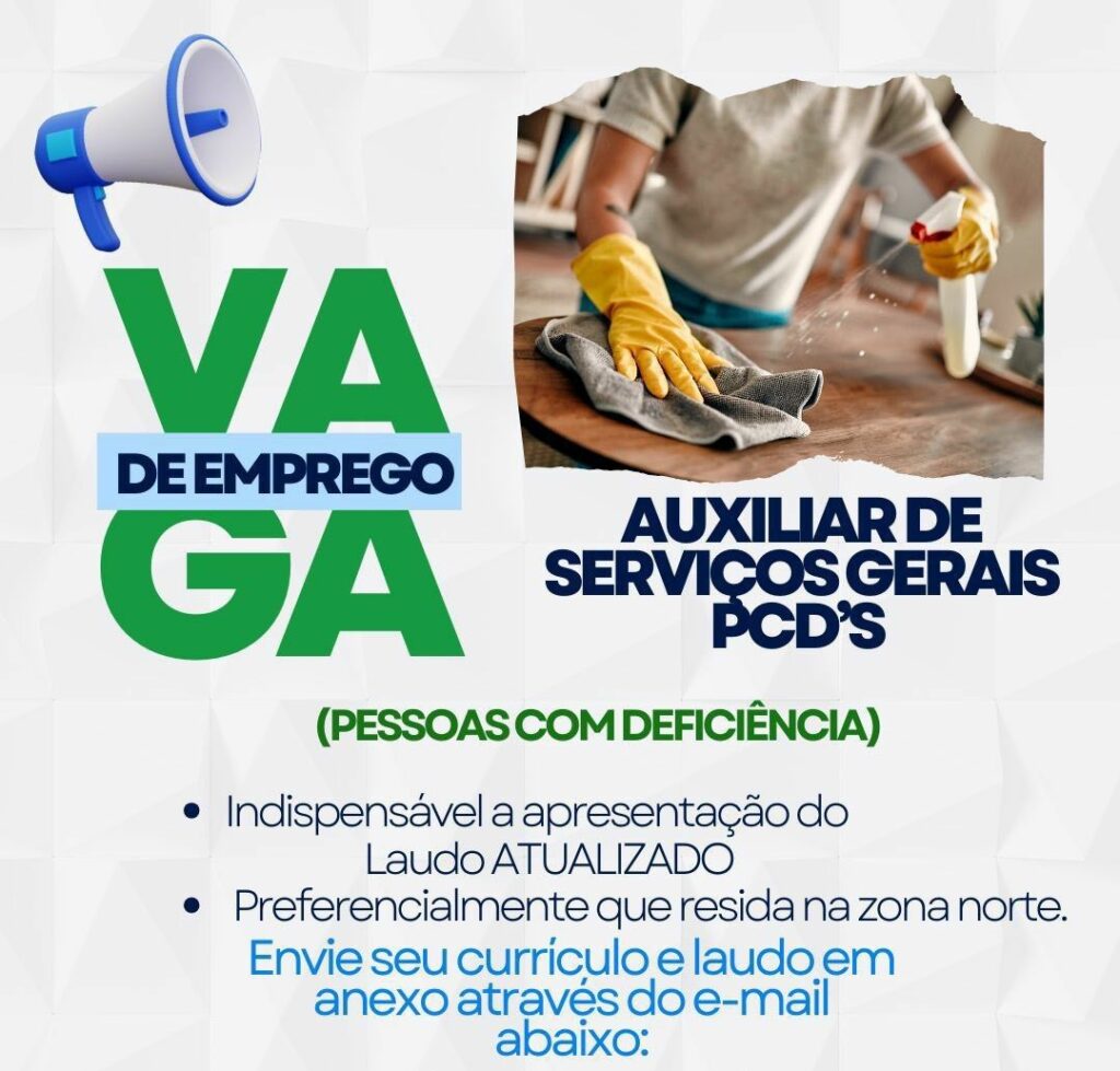 Empresa está selecionando Auxiliar de serviços gerais pcds; Envie seu currículo!