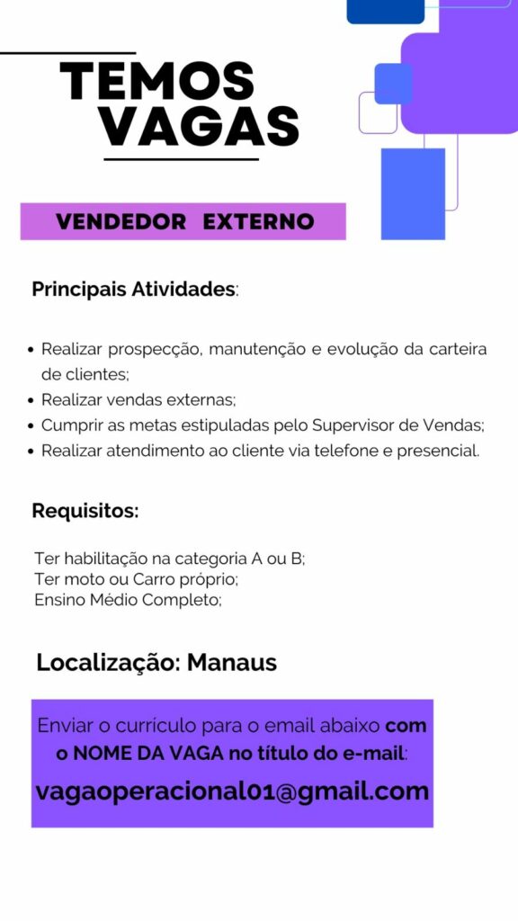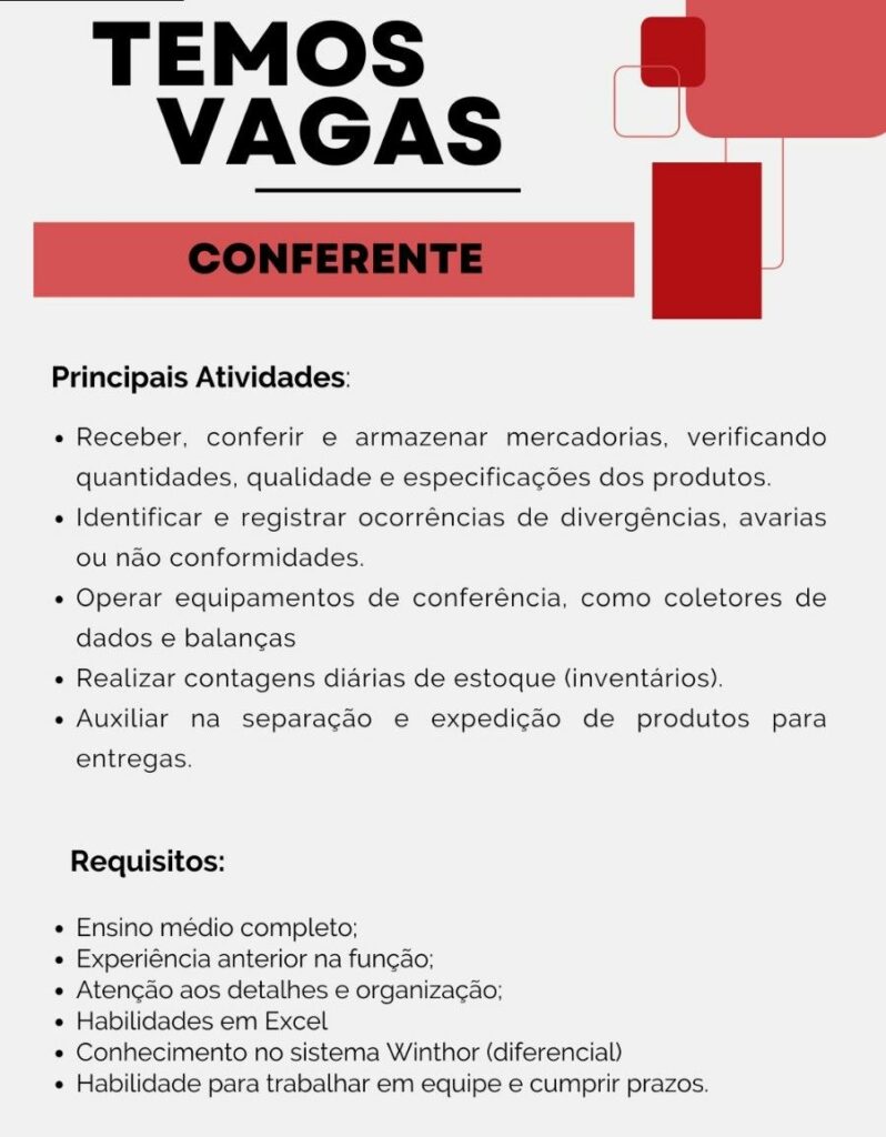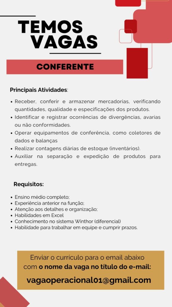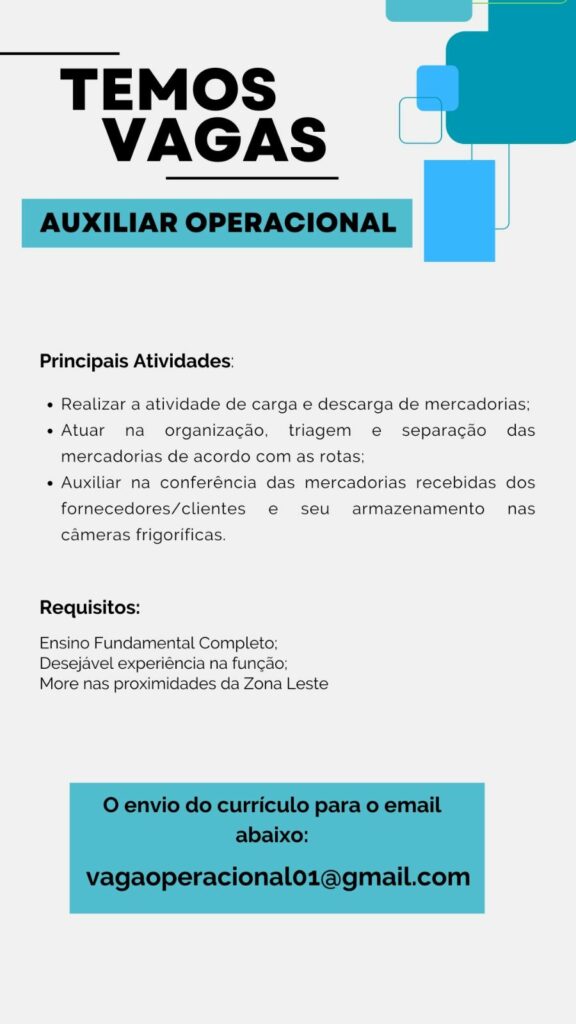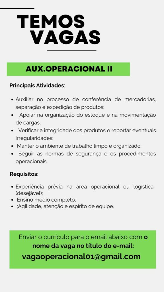 Empresa está selecionando Vendedor externo, Auxiliar operacional ll, Auxiliar operacional, Conferente; Envie seu currículo!