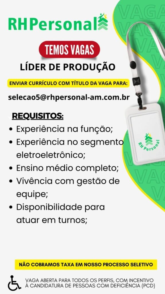 Rh seleciona para vaga de Líder de produção; Envie seu currículo!