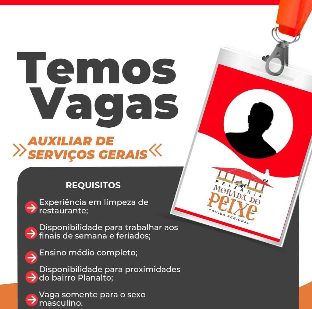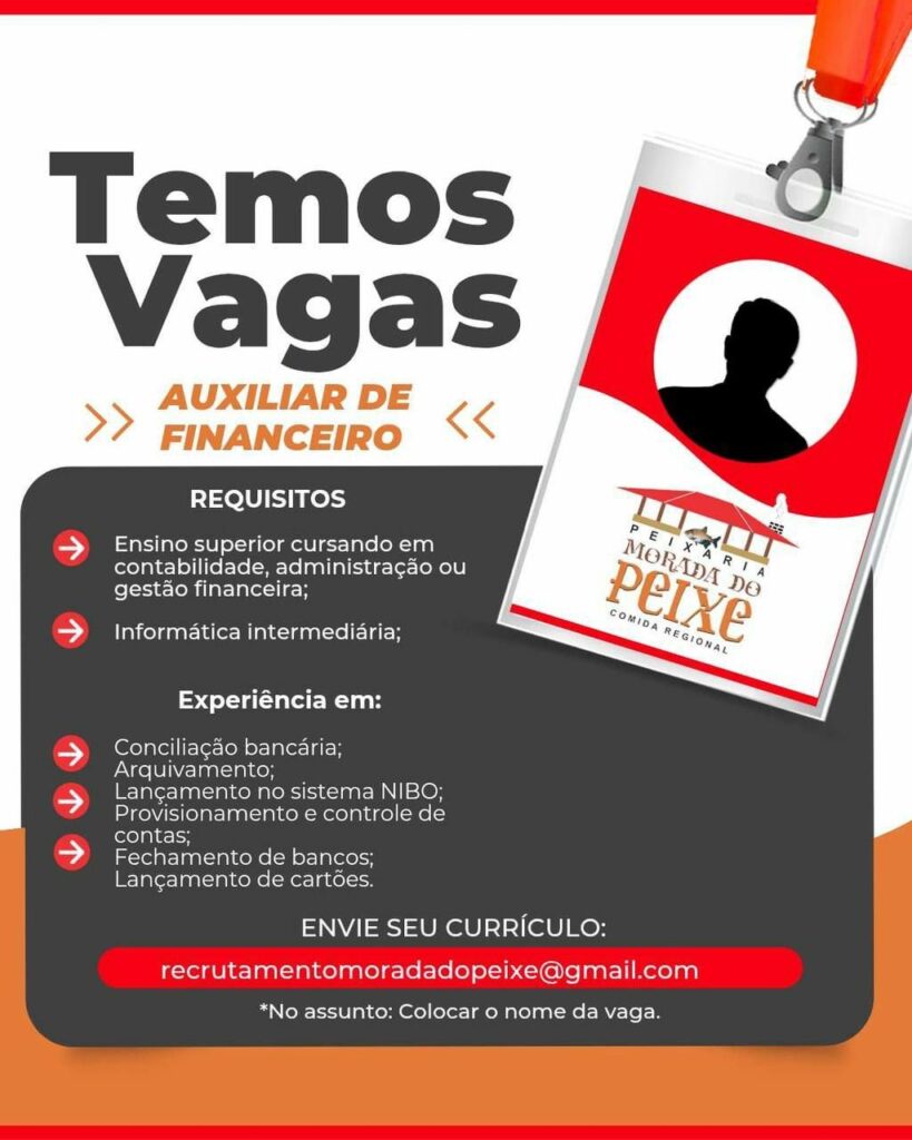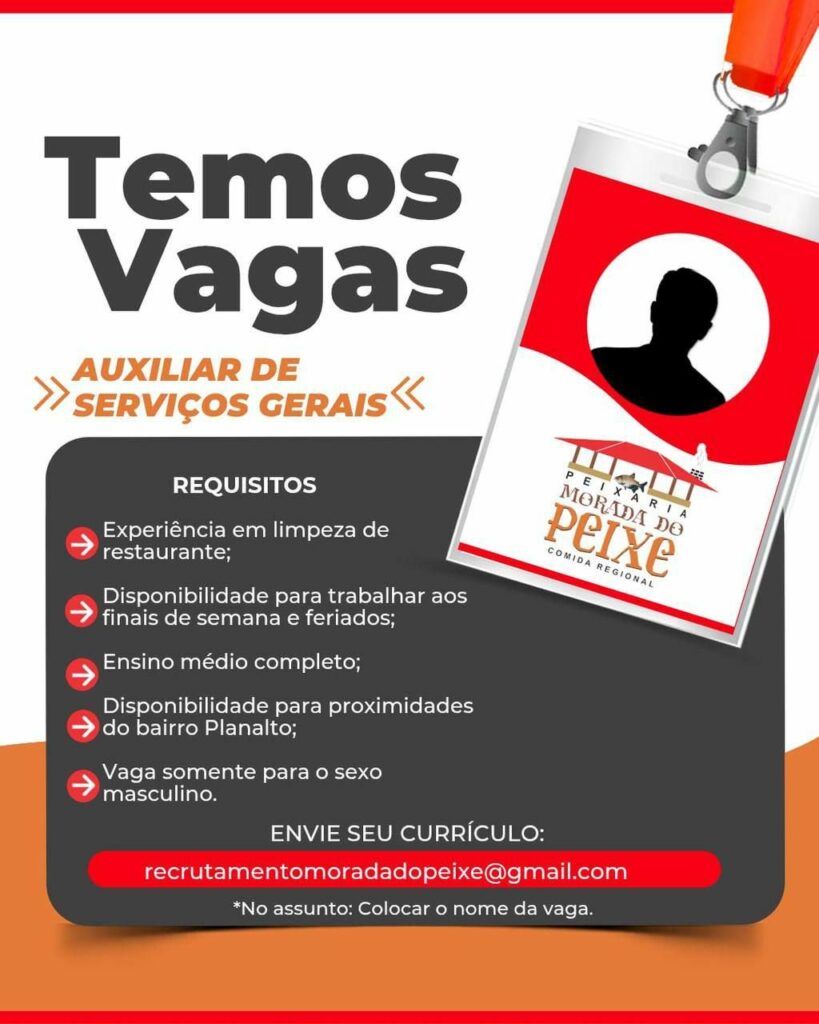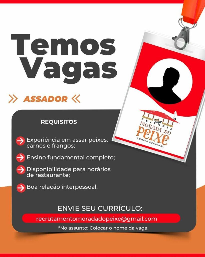 Peixaria Morada do peixe seleciona Auxiliar de financeiro, Auxiliar de serviços gerais, Assador, Lavador de carro; Envie seu currículo!