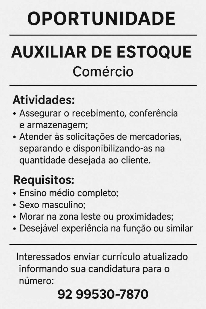 Empresa seleciona Auxiliar de estoque; Envie seu currículo!