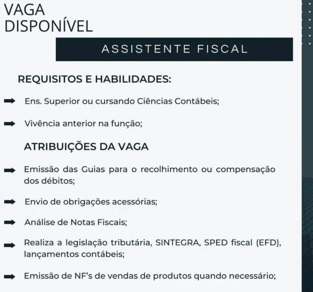 Seleção para vaga de Assistente fiscal; Envie seu currículo!