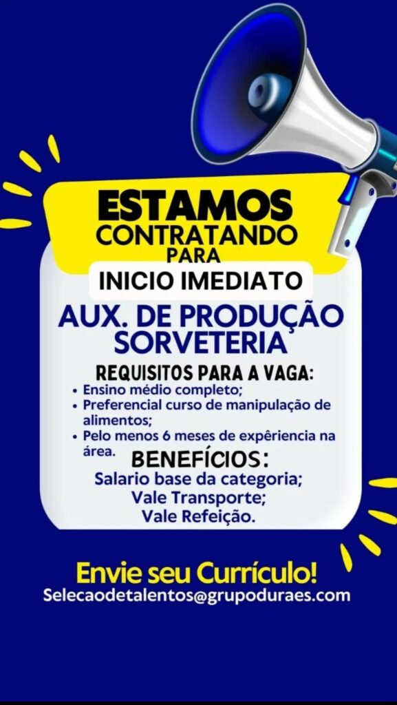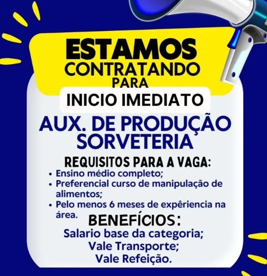 Seleção para vaga de Auxiliar de produção Sorveteria; Envie seu currículo!