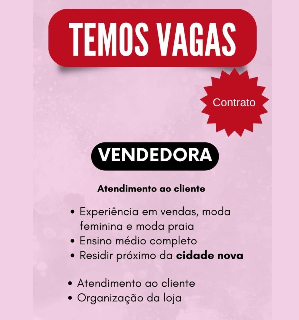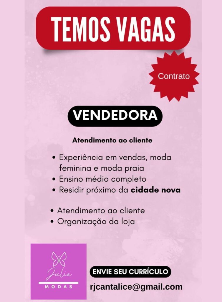 Loja moda feminina seleciona Vendedora; Envie seu currículo!