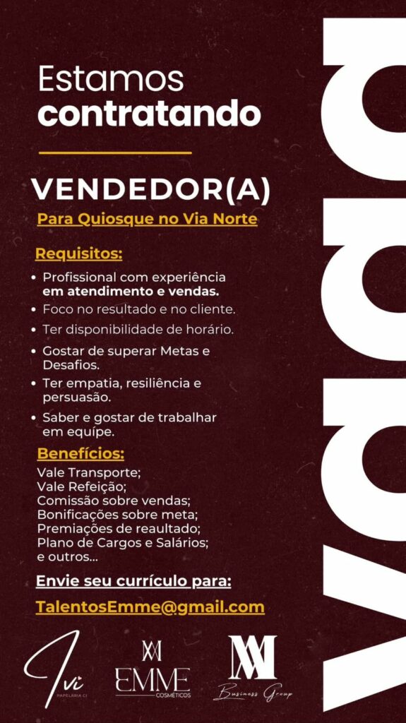 Quiosque no shopping Via norte seleciona Vendedor (a); Envie seu currículo!